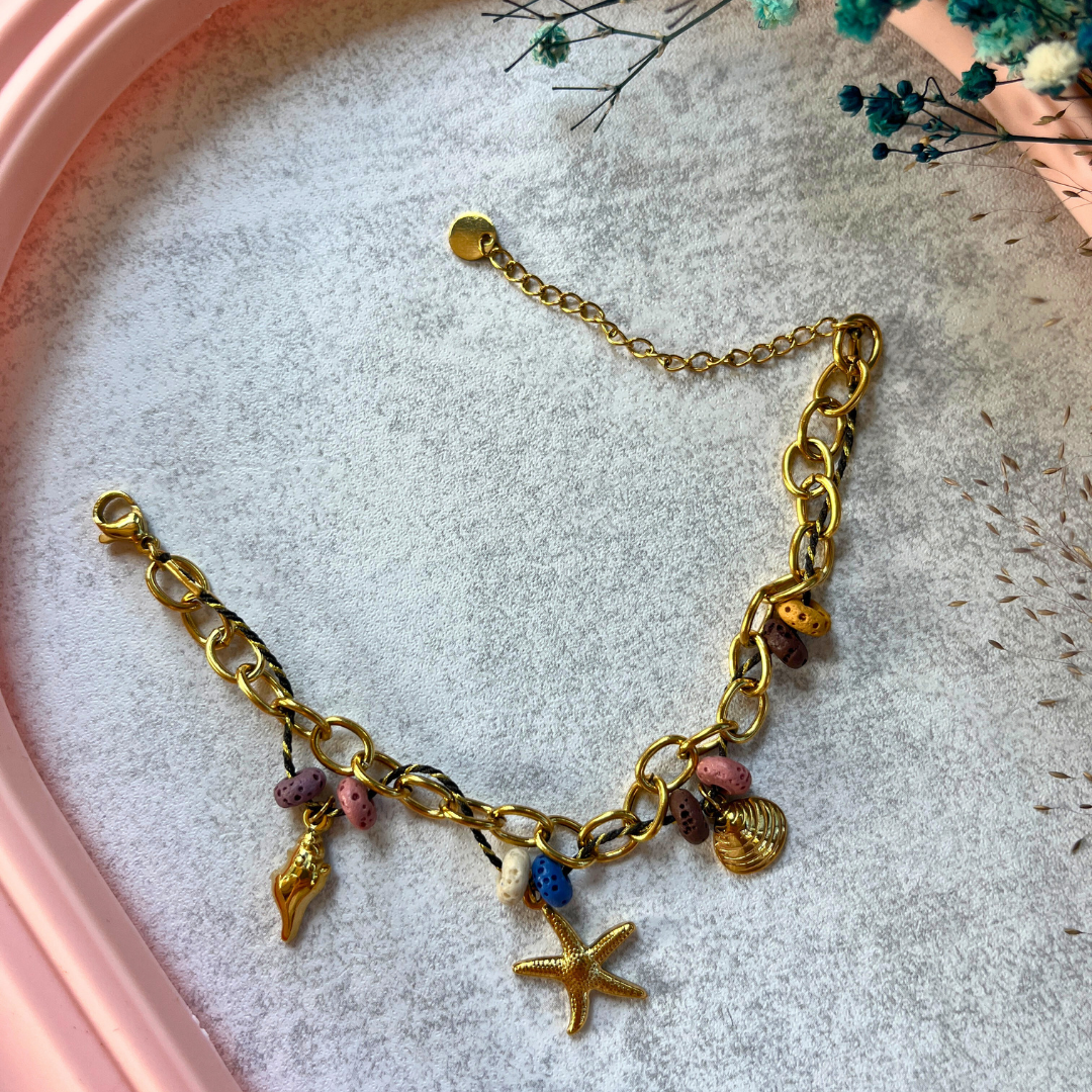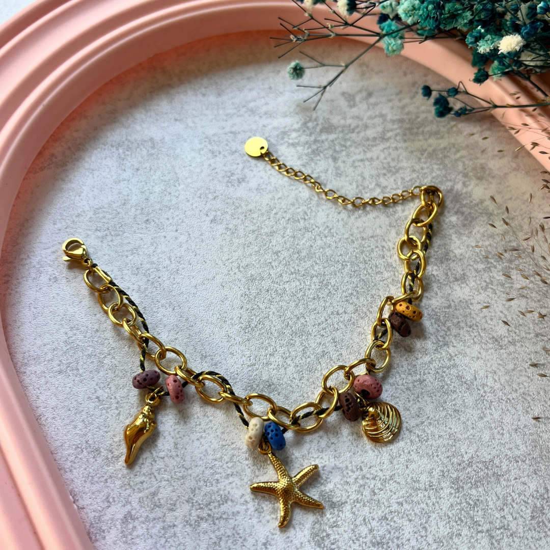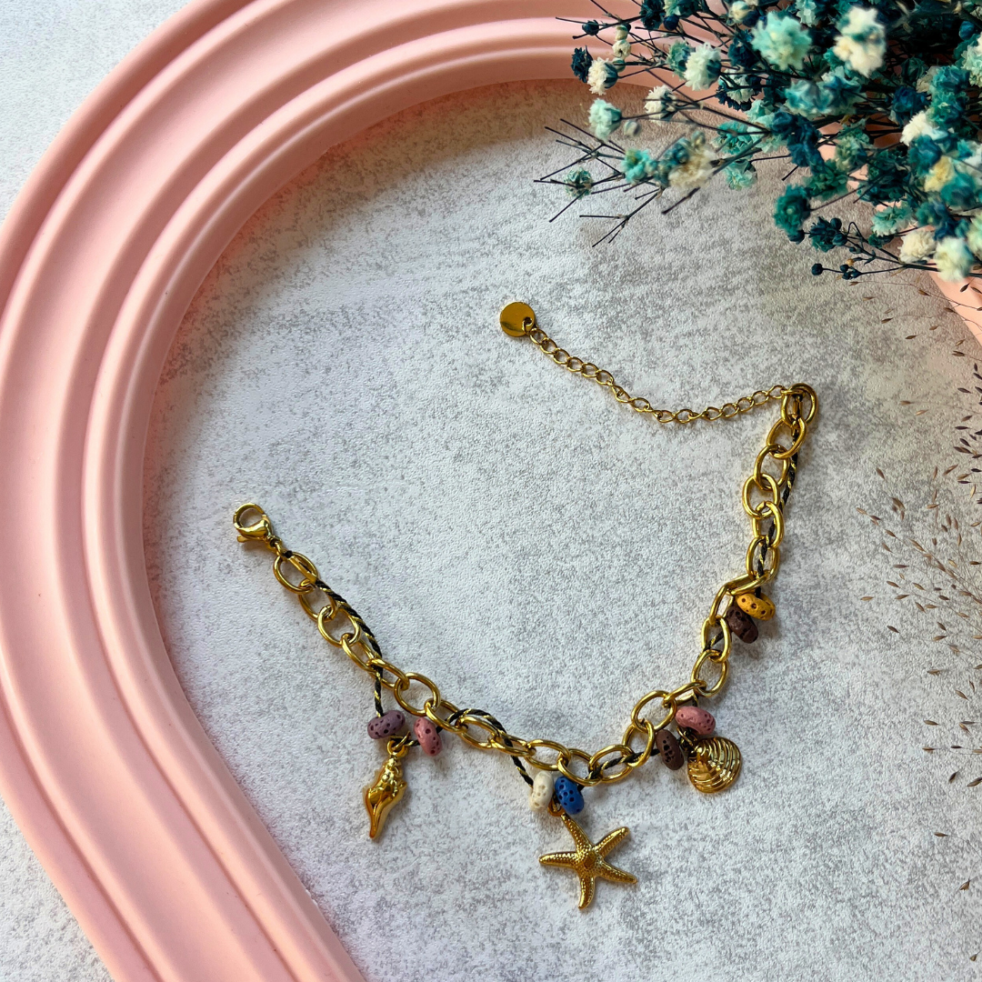 Altın tonlu halkalar ve doğal taş görünümlü detaylarla süslenen bu bileklik, yıldız, deniz kabuğu ve denizci figürleriyle tam bir ada esintisi sunuyor.