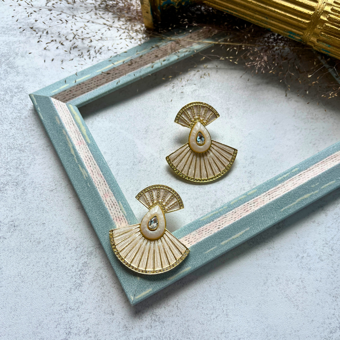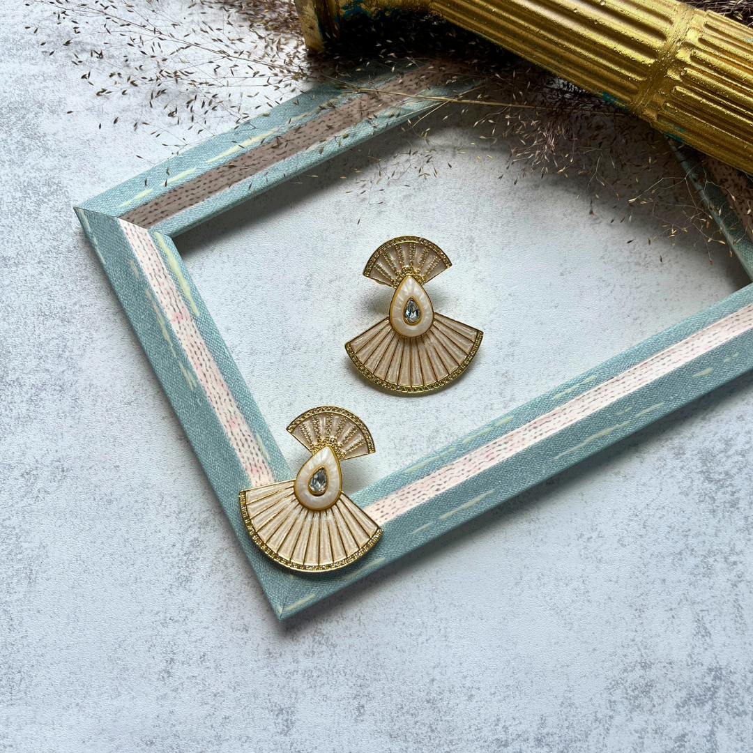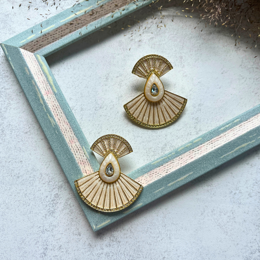 Altın Rengi Yelpaze Formlu Taş Detaylı Küpe I Mev'Art Collection