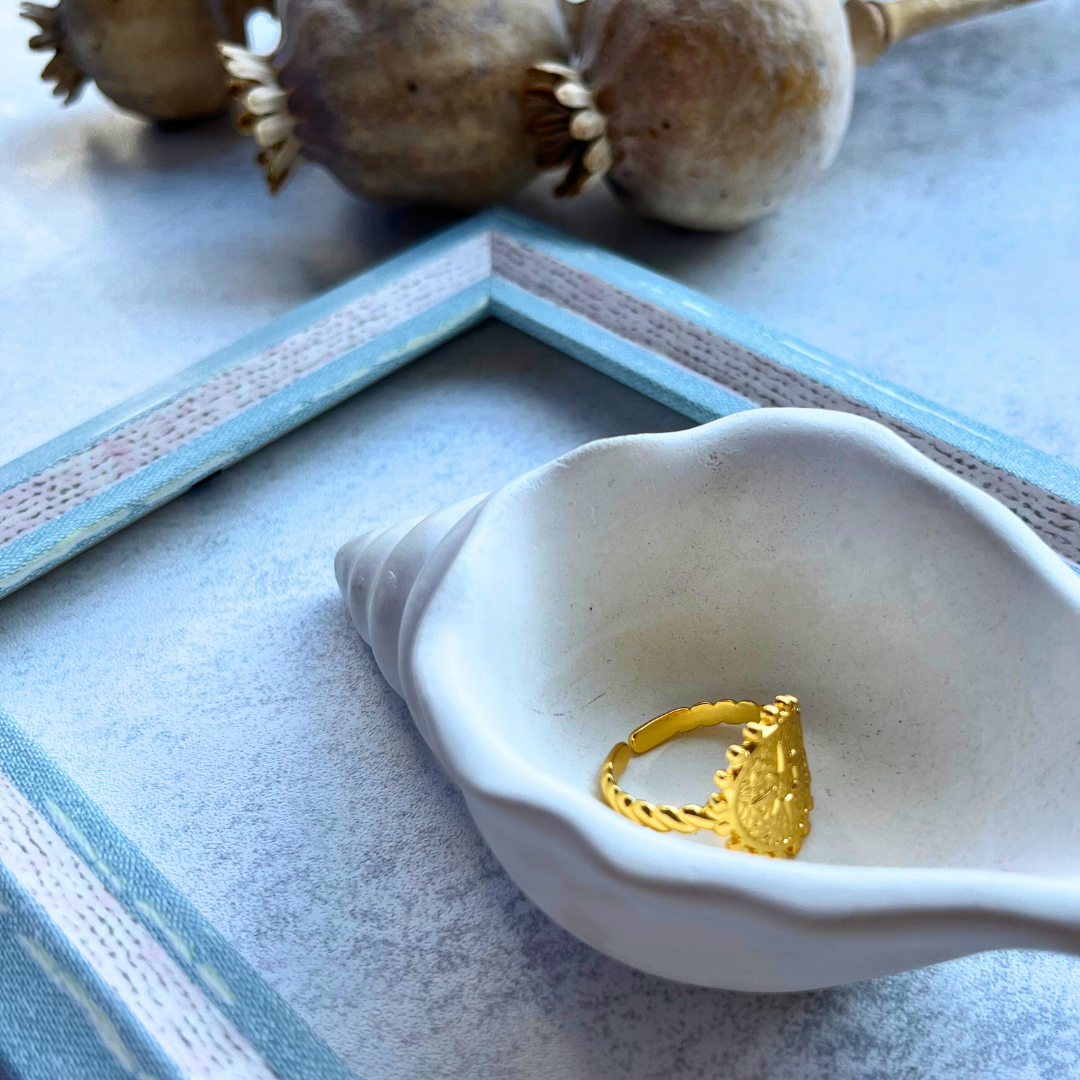 Tırtıklı dış hatlar, yüzüğe karakteristik bir doku kazandırır.