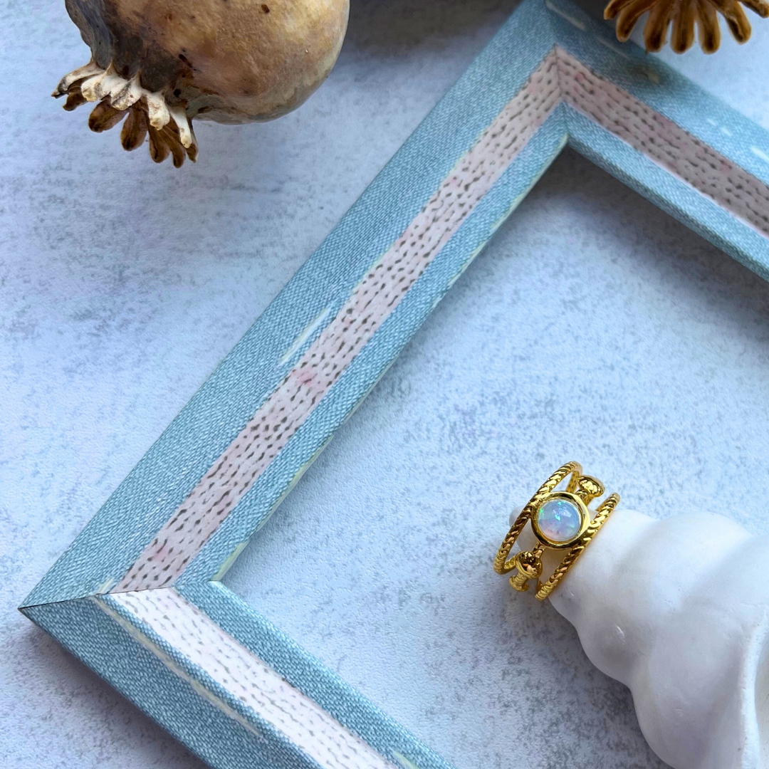 Işıltılı, opal görünümlü doğal taş merkezli tasarım.