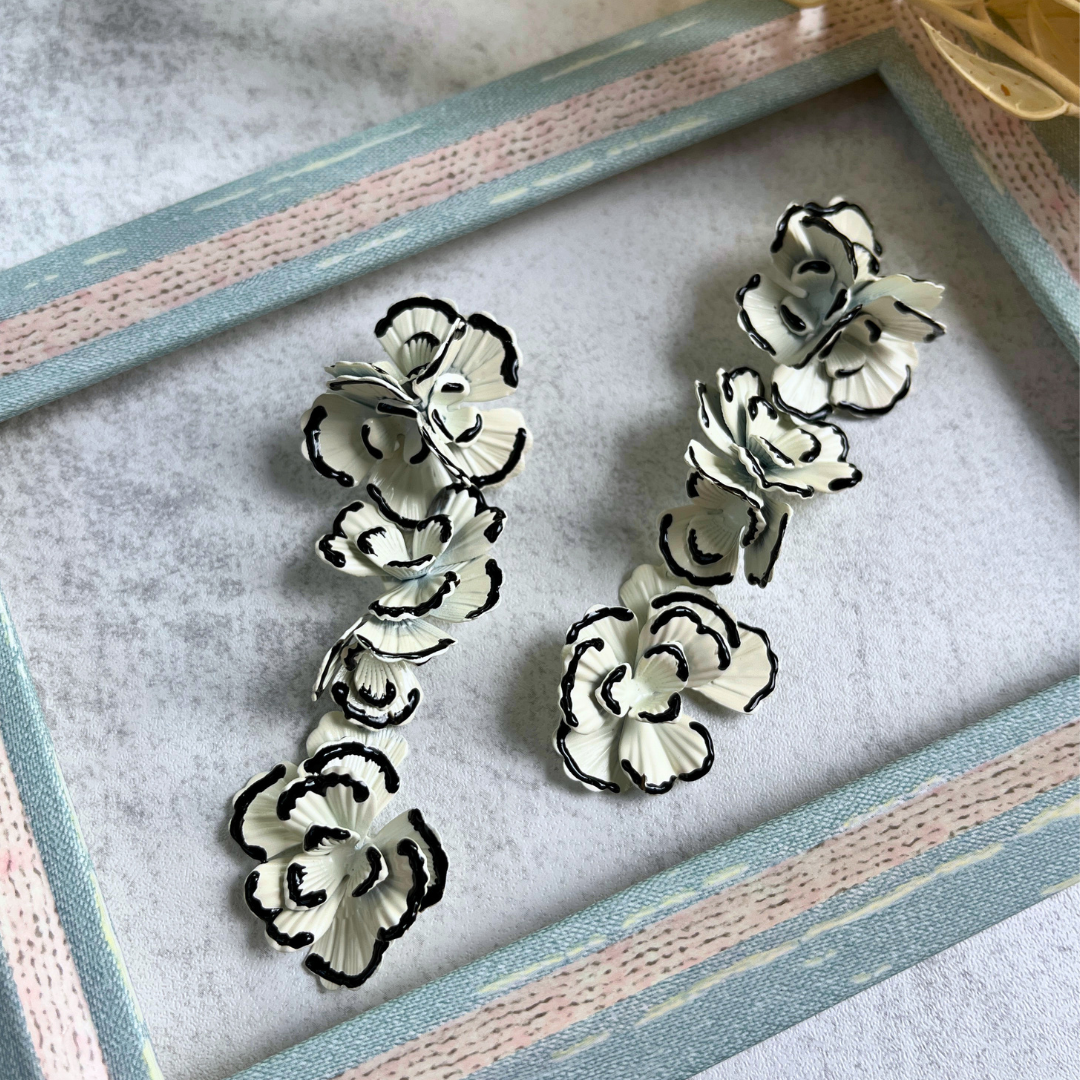 Siyah konturlu beyaz çiçek tasarımıyla modern ve sofistike bir görünüm sunar.