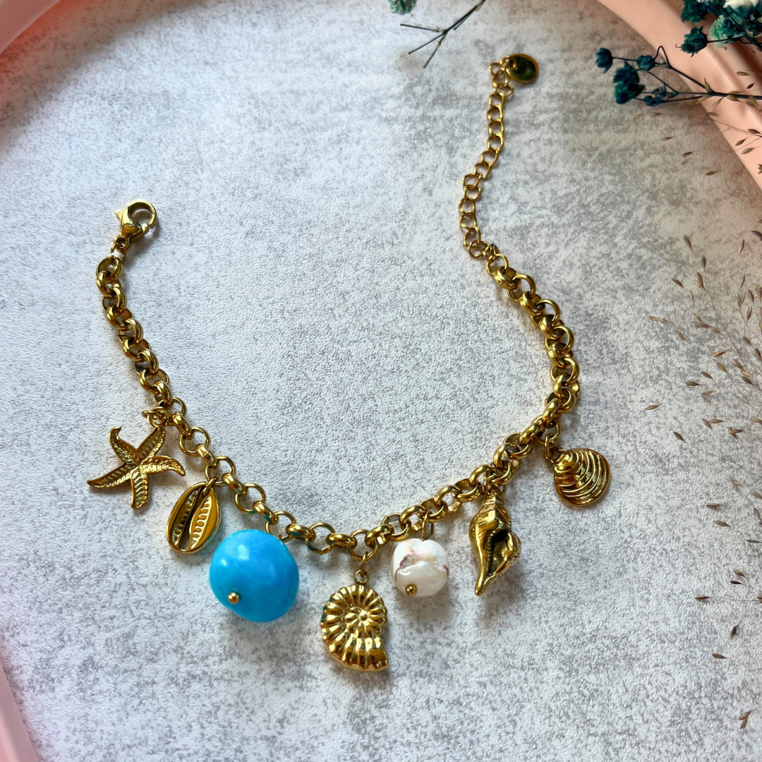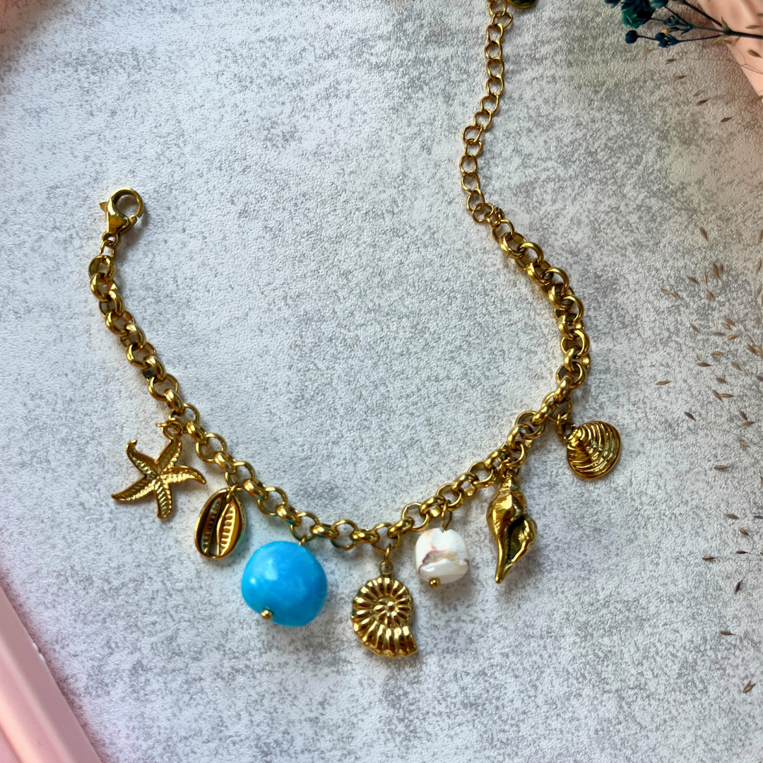 Altın ton zincire dizili deniz yıldızı, mavi taş, midye ve deniz kabuklarıyla özgür ruhlara özel bir tasarım. Her anı tatil gibi yaşa!