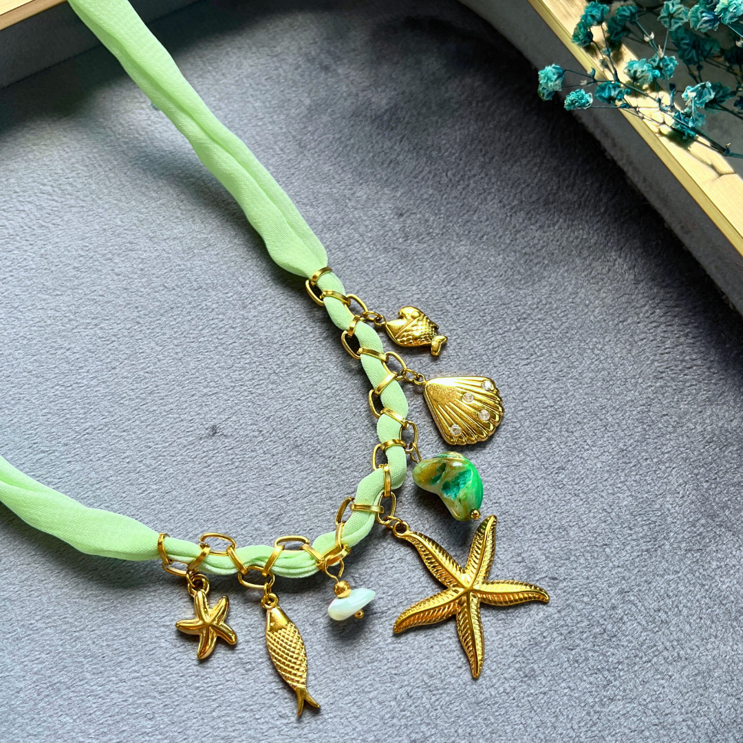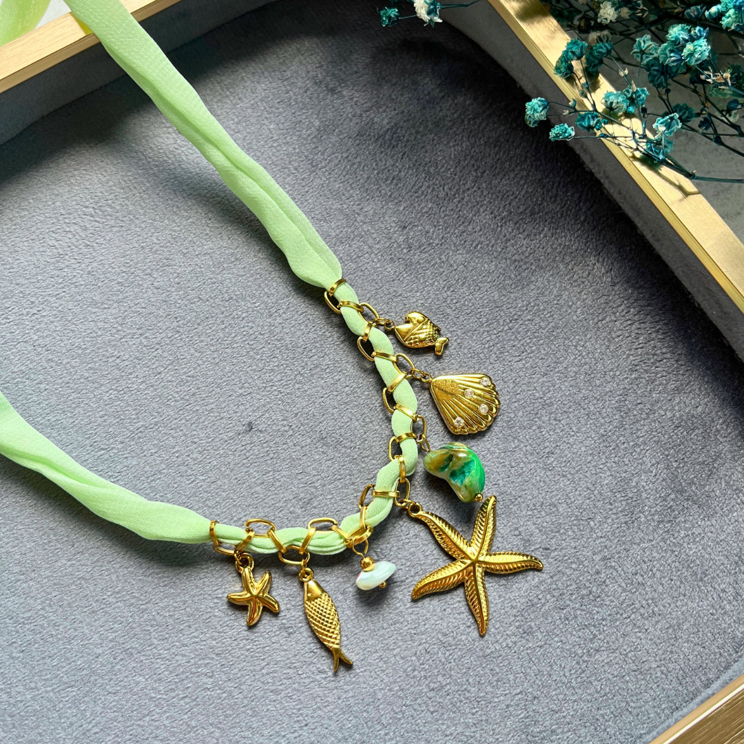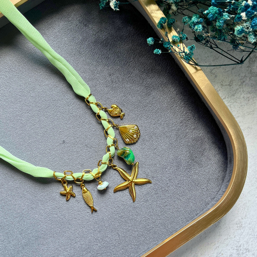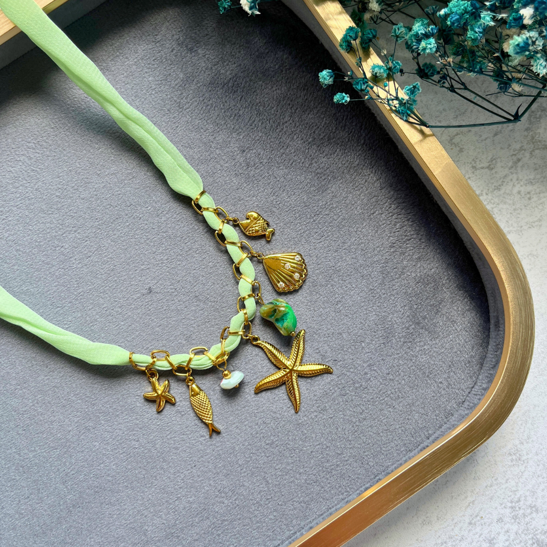 Altın rengi deniz yıldızı, balık, midye ve doğal taş charm detaylı.