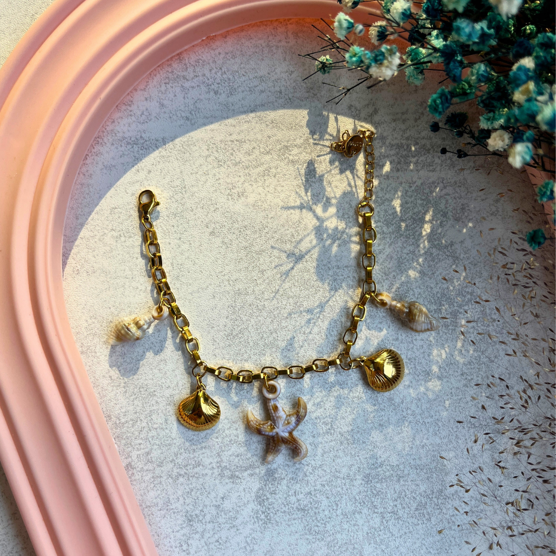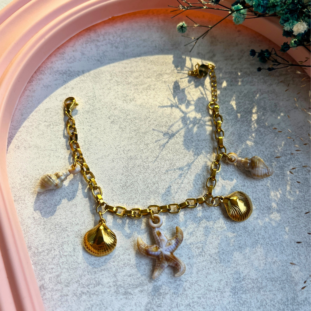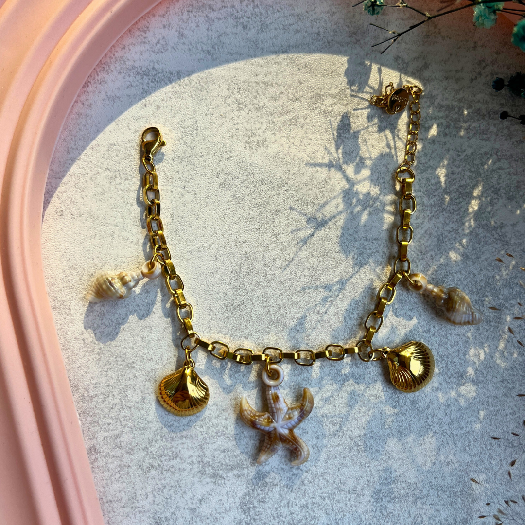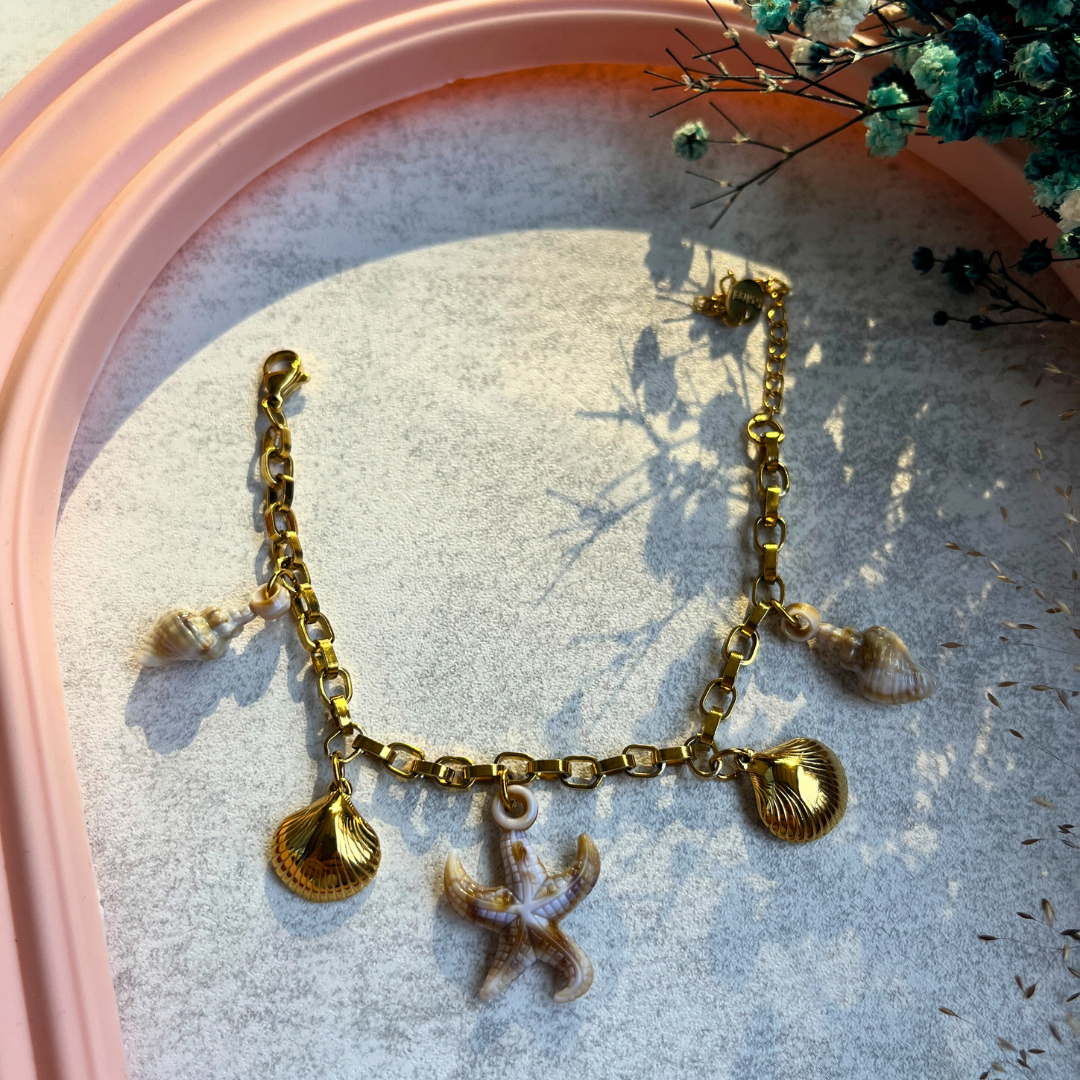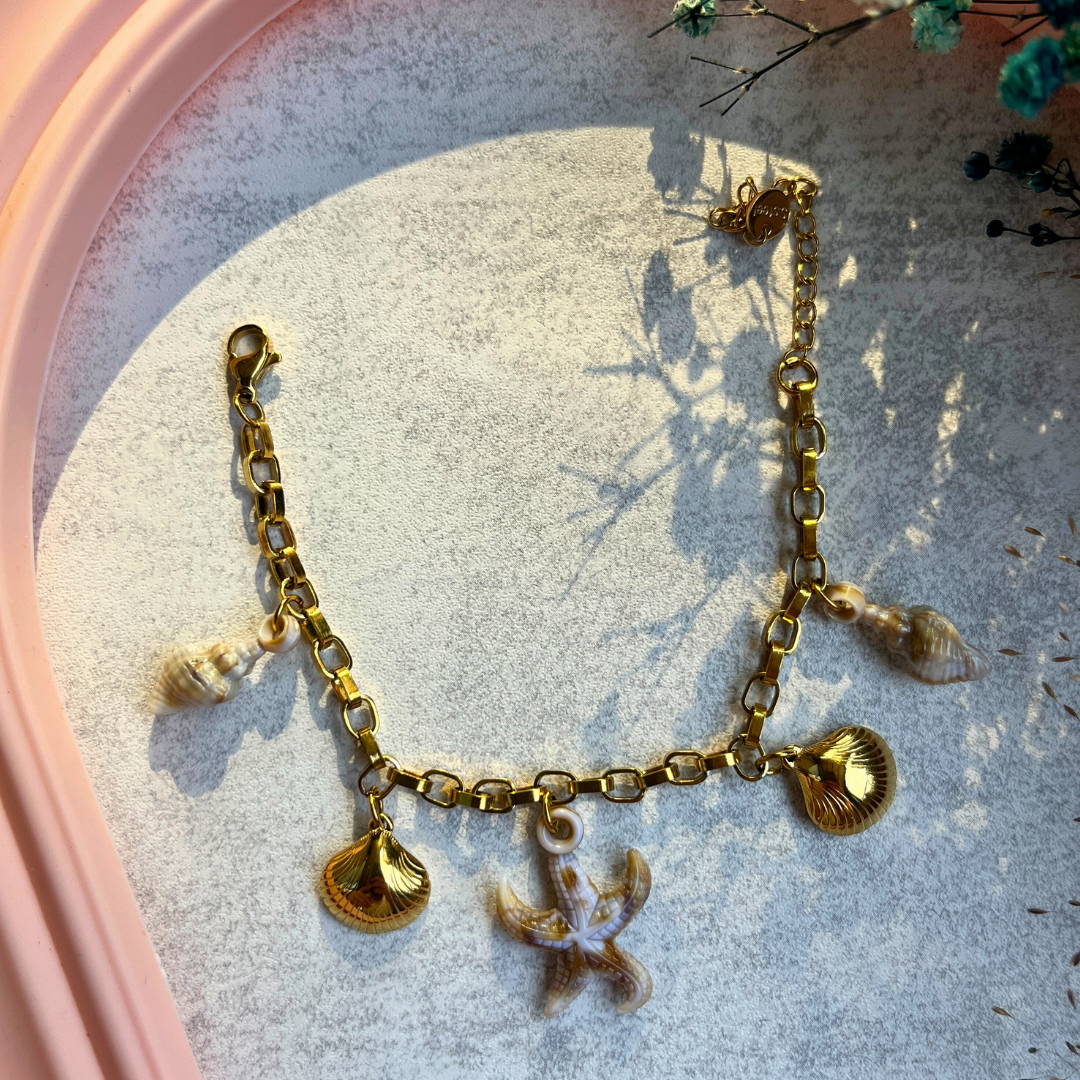 Denizin ruhunu bileğinizde taşıyın. Altın rengi zincir üzerine yerleştirilmiş deniz kabuğu ve denizyıldızı figürleriyle yazın en ışıltılı hali sizinle.