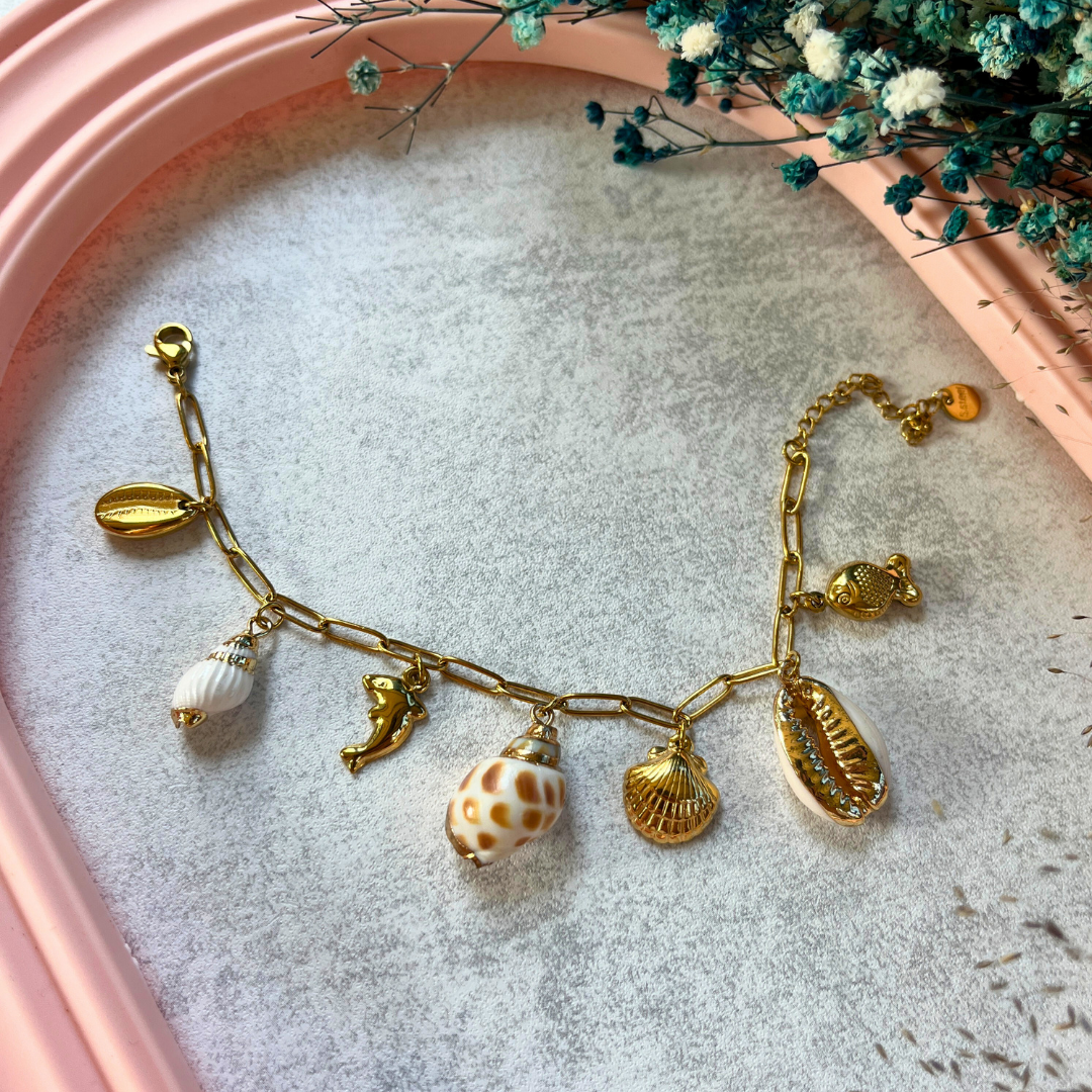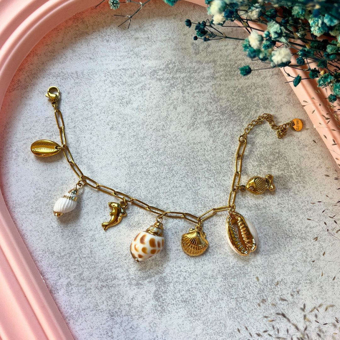 Mev'ADA Koleksiyonu’nun en doğal esintisi bu zarif bileklik; altın renkli zincir üzerine dizilen gerçek deniz kabukları ve deniz kızı, balık, midye gibi figürlerle tasarlandı.