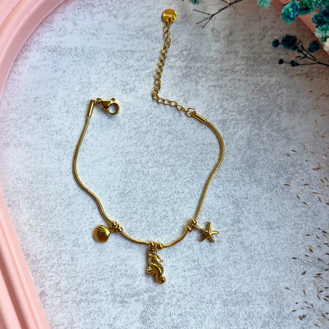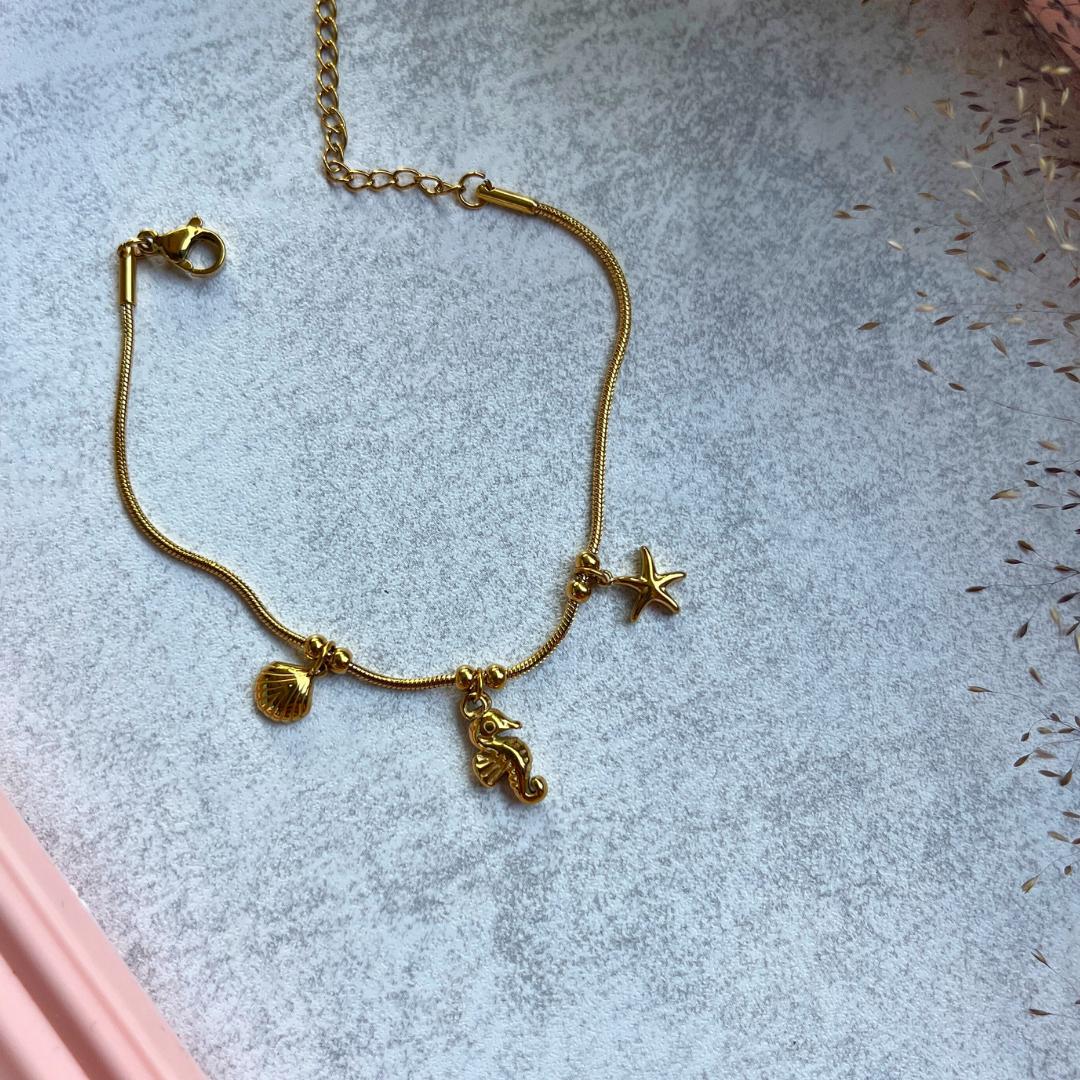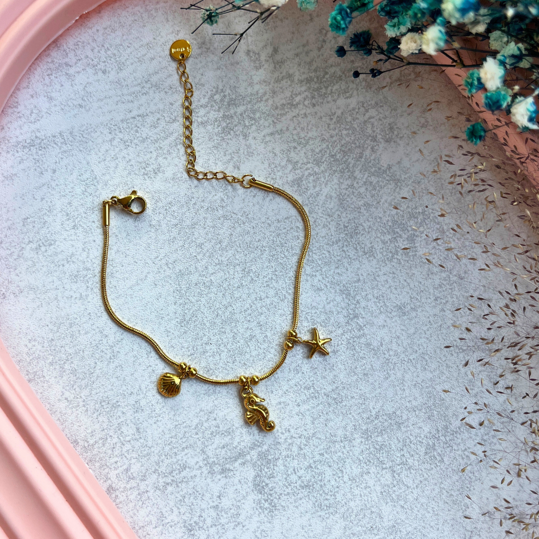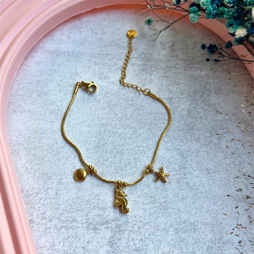 🌊 Altın rengi yılan zinciri üzerine zarifçe dizilmiş deniz yıldızı, denizatı ve deniz kabuğu figürleriyle sade ama etkileyici bir tasarım.