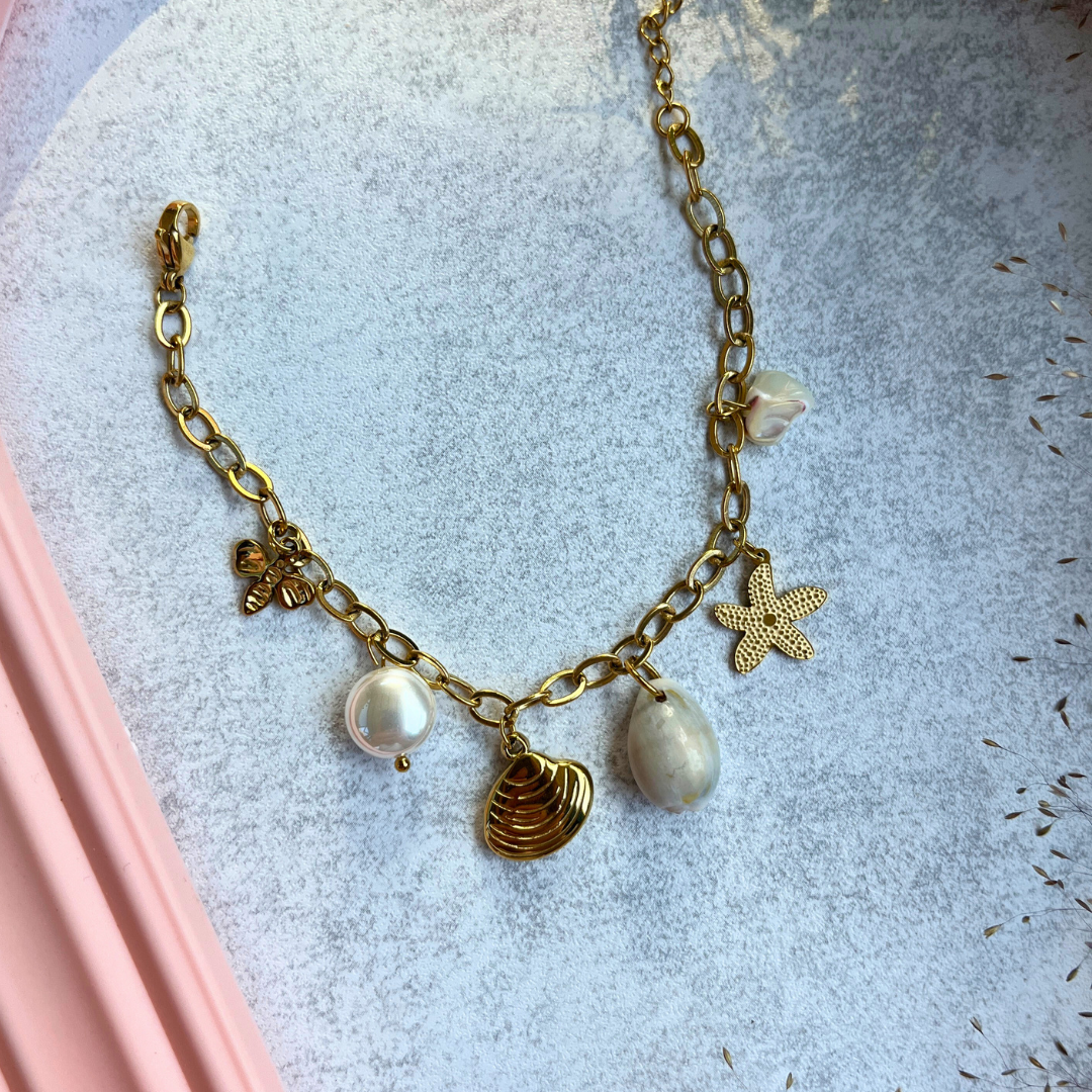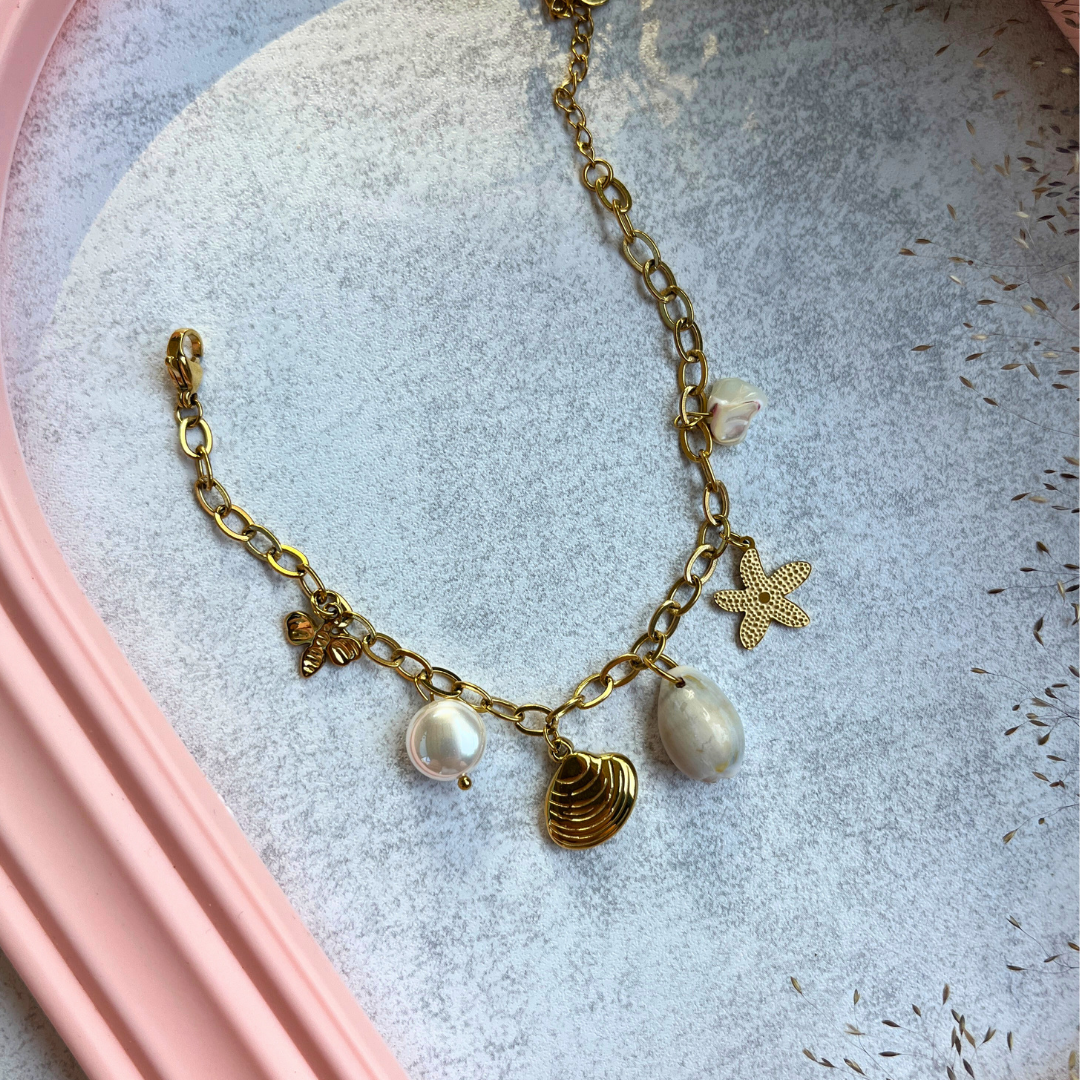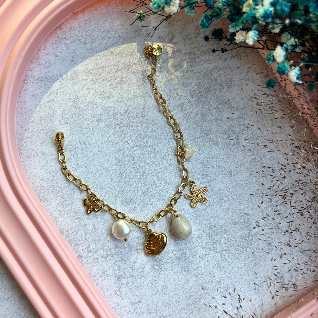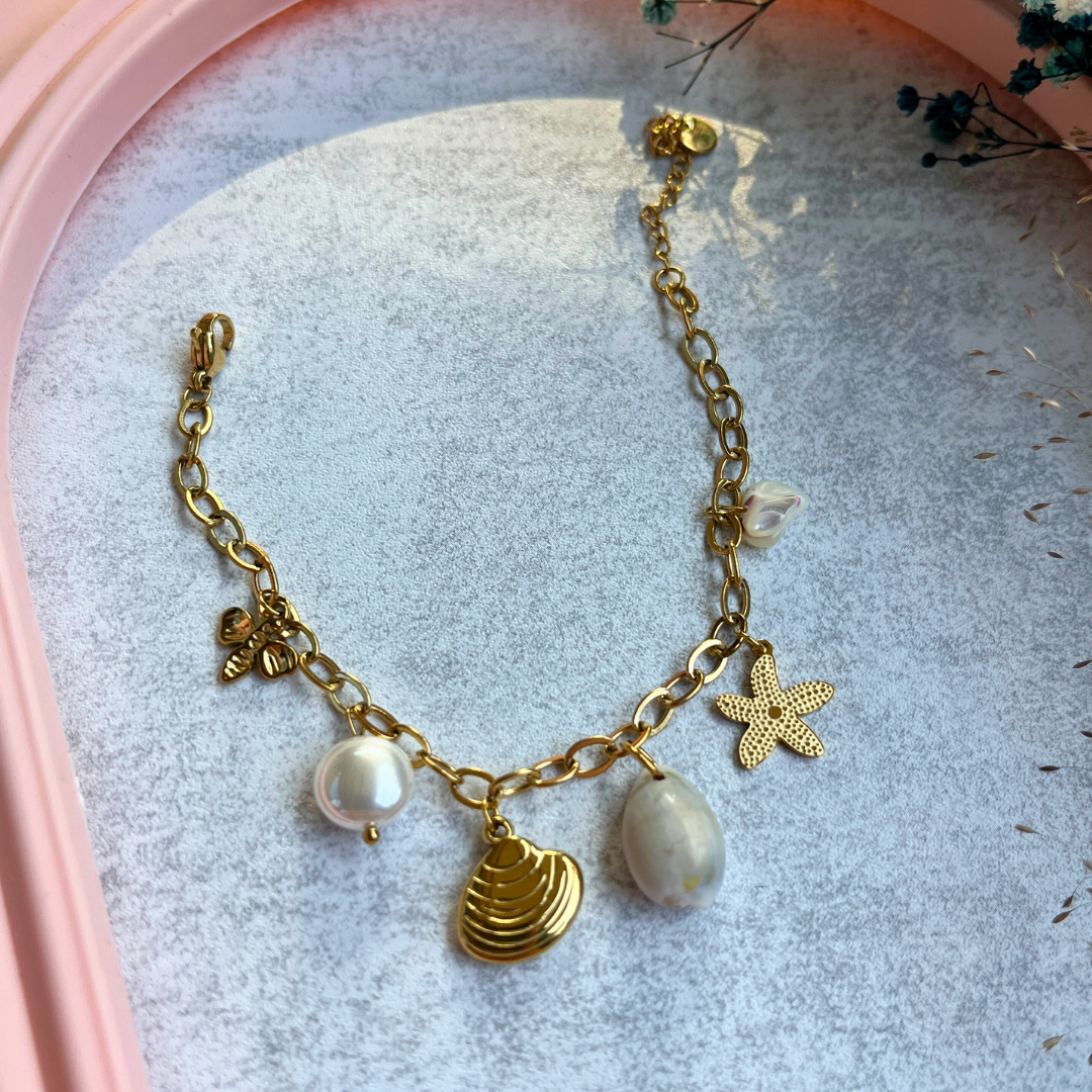 Doğadan ilham alan bu zarif bileklikle bileğinizde incelik taşıyın. Deniz kabuğu, inciler ve yıldız figürüyle yaz stilinize sıcak dokunuşlar katın.
