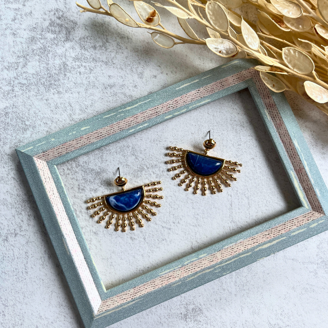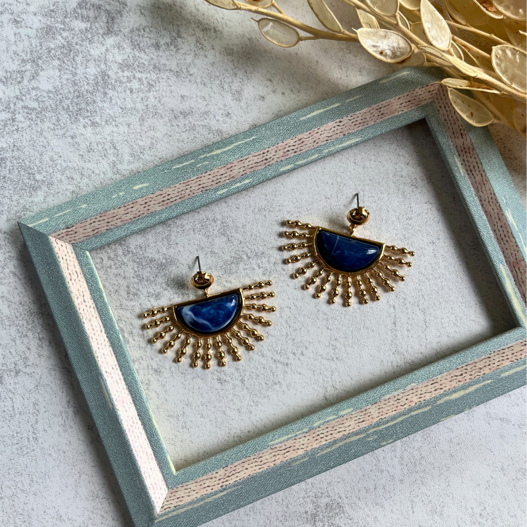 Zengin lacivert taş detayı ile göz alıcı bir görünüm sunar.