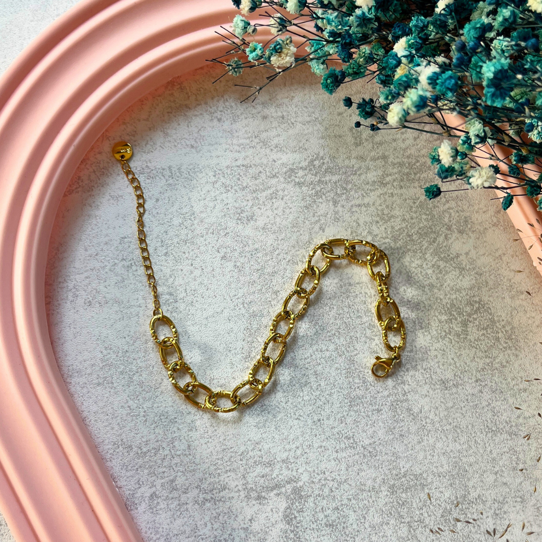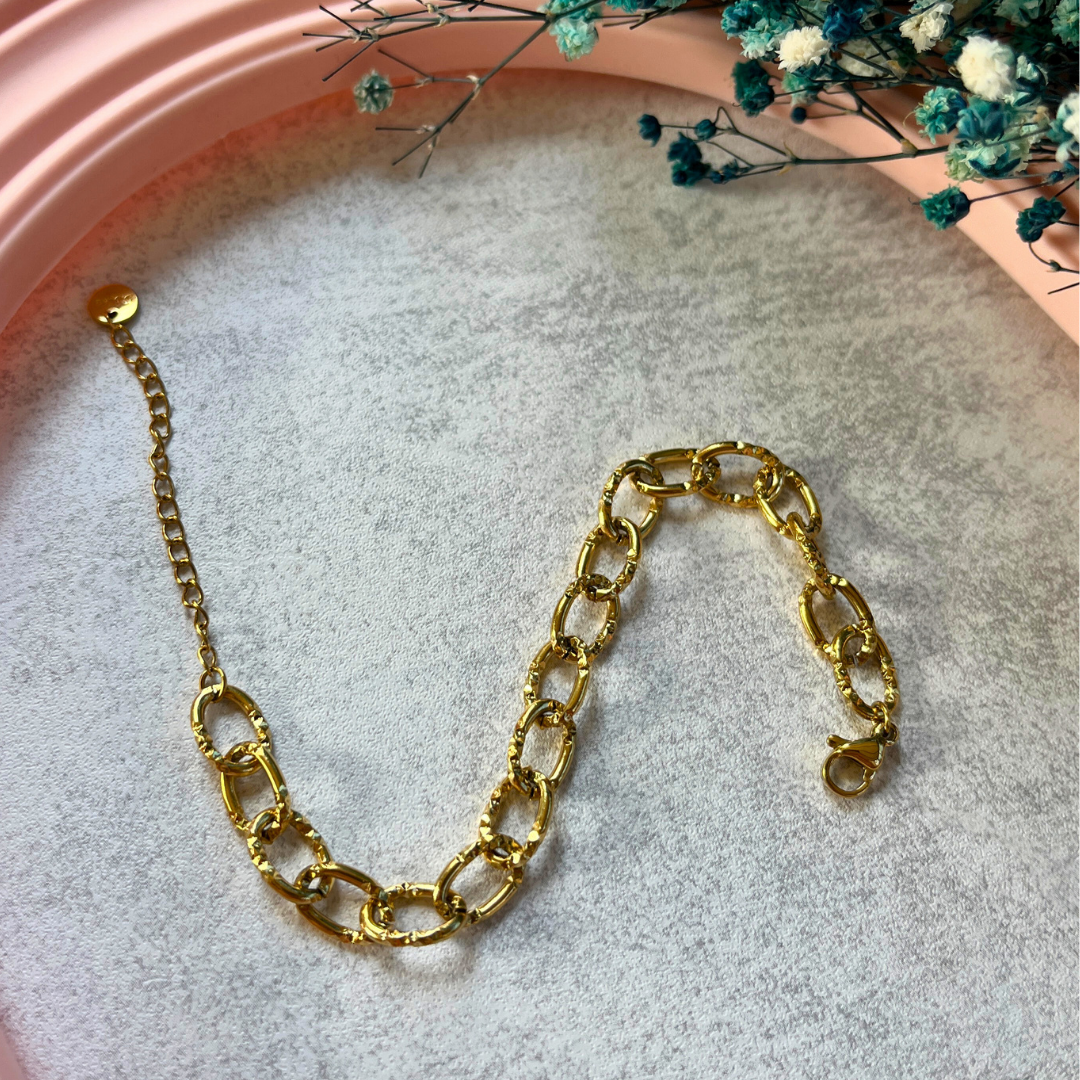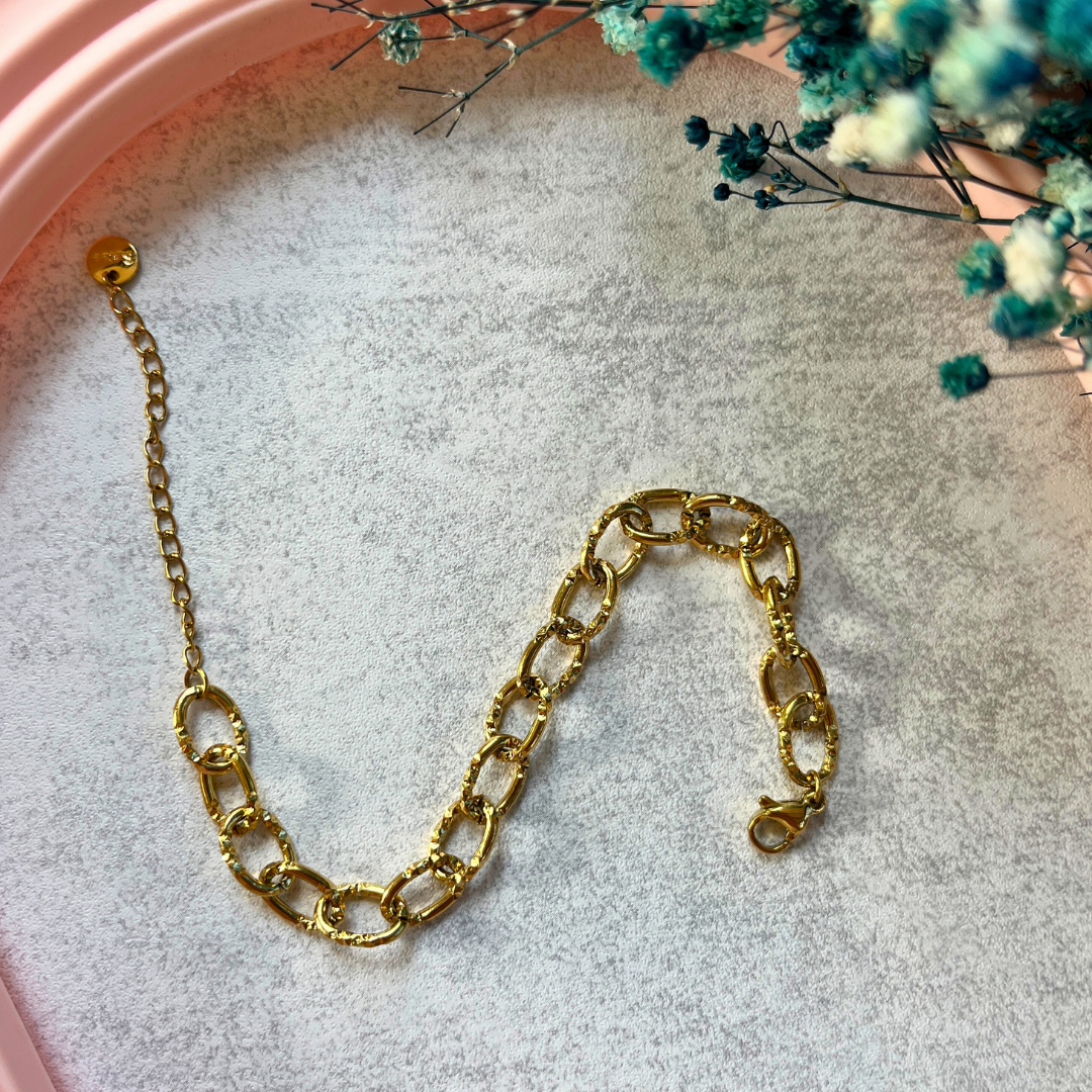 Altın rengindeki bu dokulu zincir bileklik; güçlü formu, sade şıklığı ve iddialı duruşuyla her kombine anında uyum sağlar.