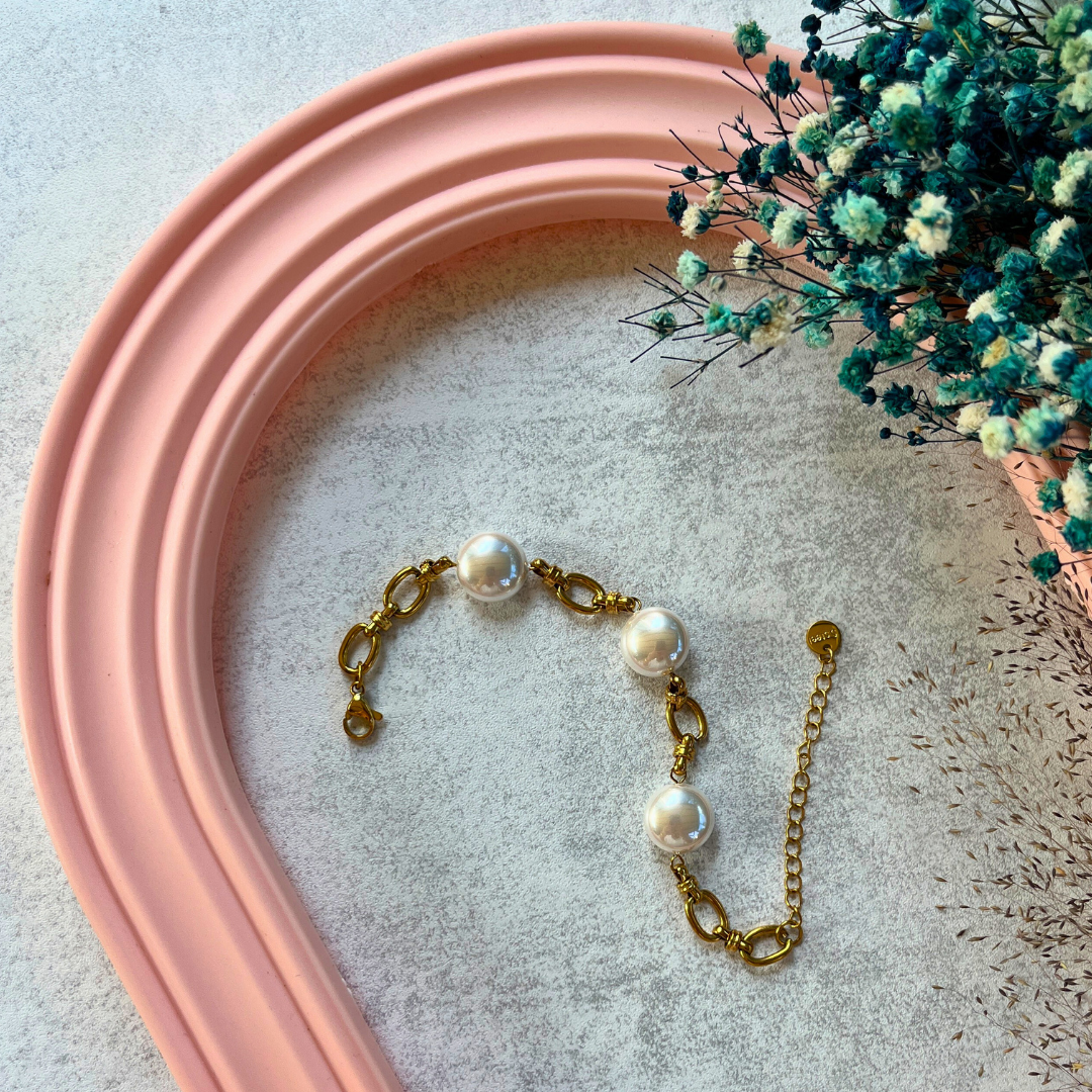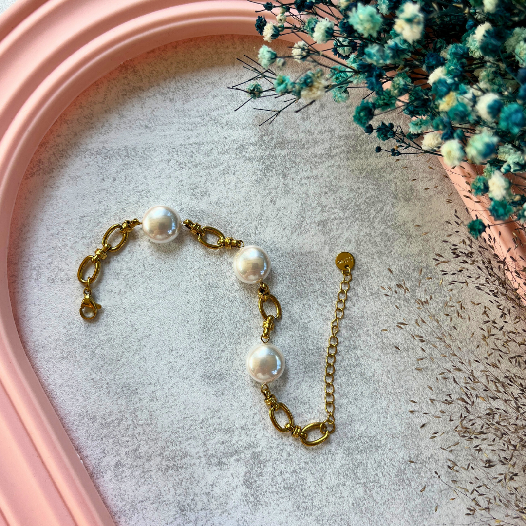 Altın rengi halkalarla birleşen 4 büyük inci detay, klasik stilin modern bir yorumu olarak bileğinizde yerini alıyor. Gündüzden geceye, her kombine zarafet katacak özel bir parça.
