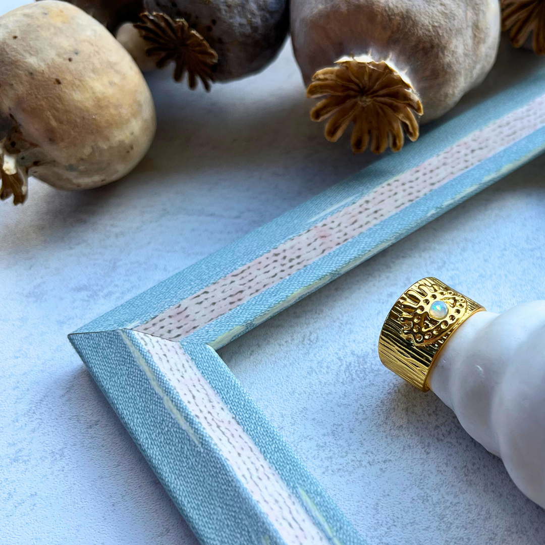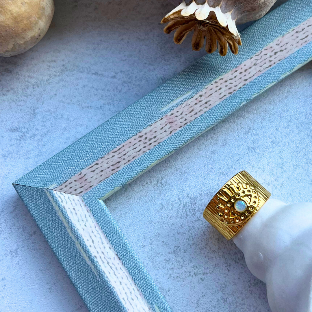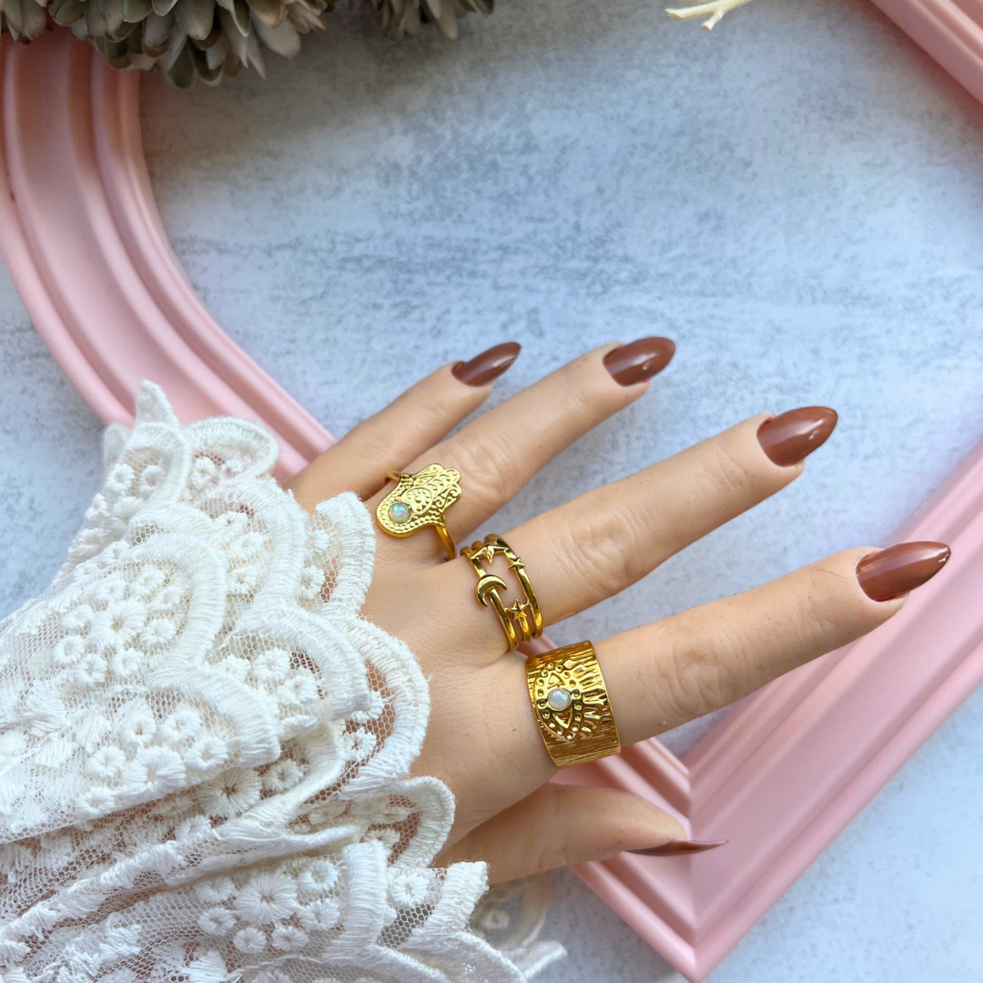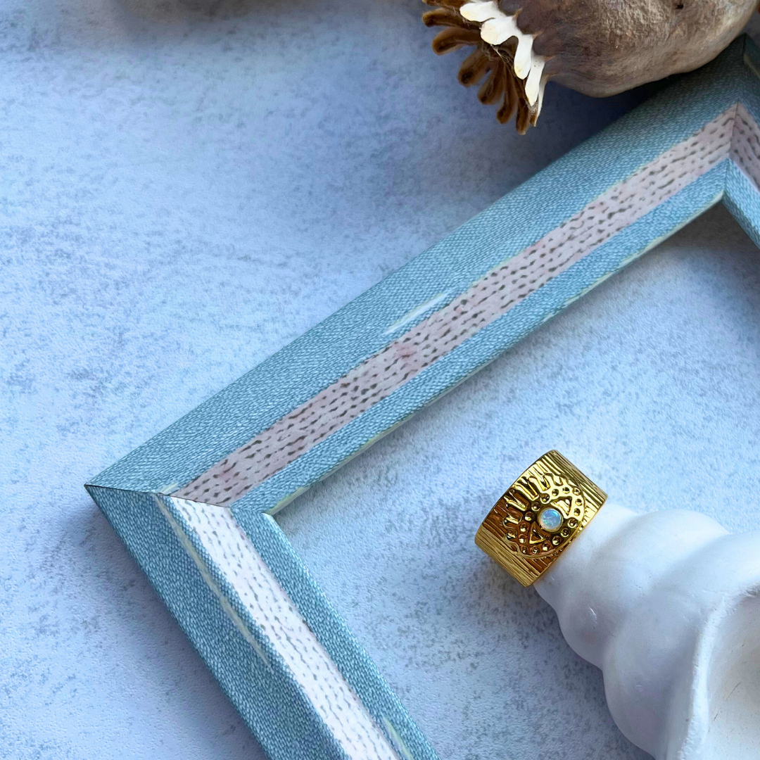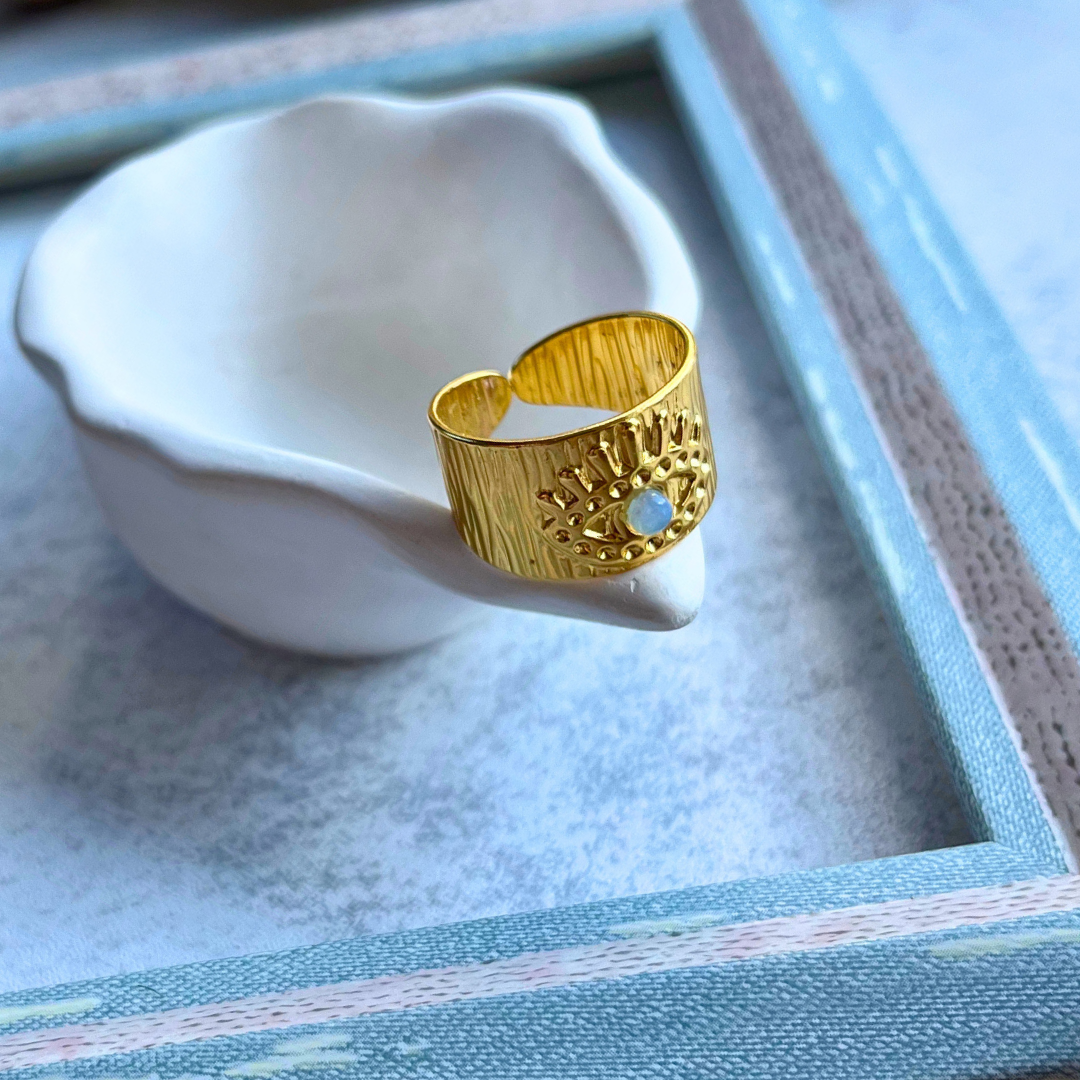 Işın formlu yüzey detayları ve ortasında inci yansımalı taşla dikkat çeker.