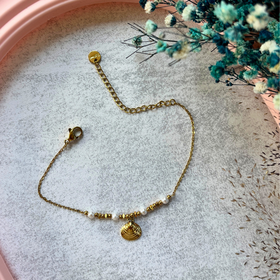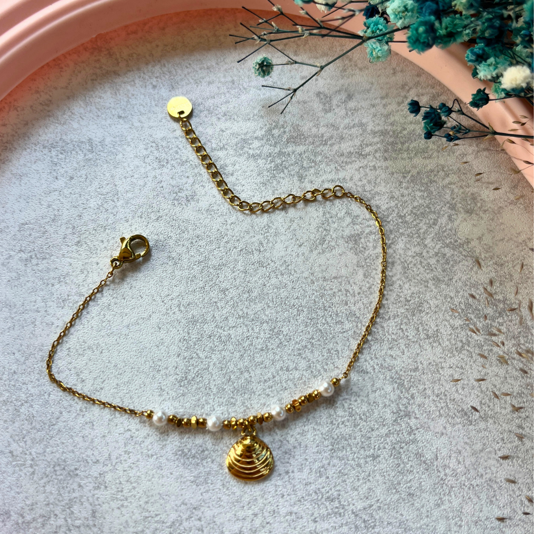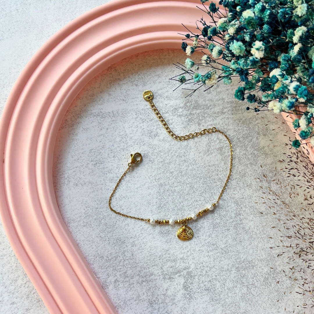 İnci Kıyısı bileklik; deniz kabuğu figürü, inci detayları ve altın ışıltısıyla yazın sadeliğini bileğinizde taşır.