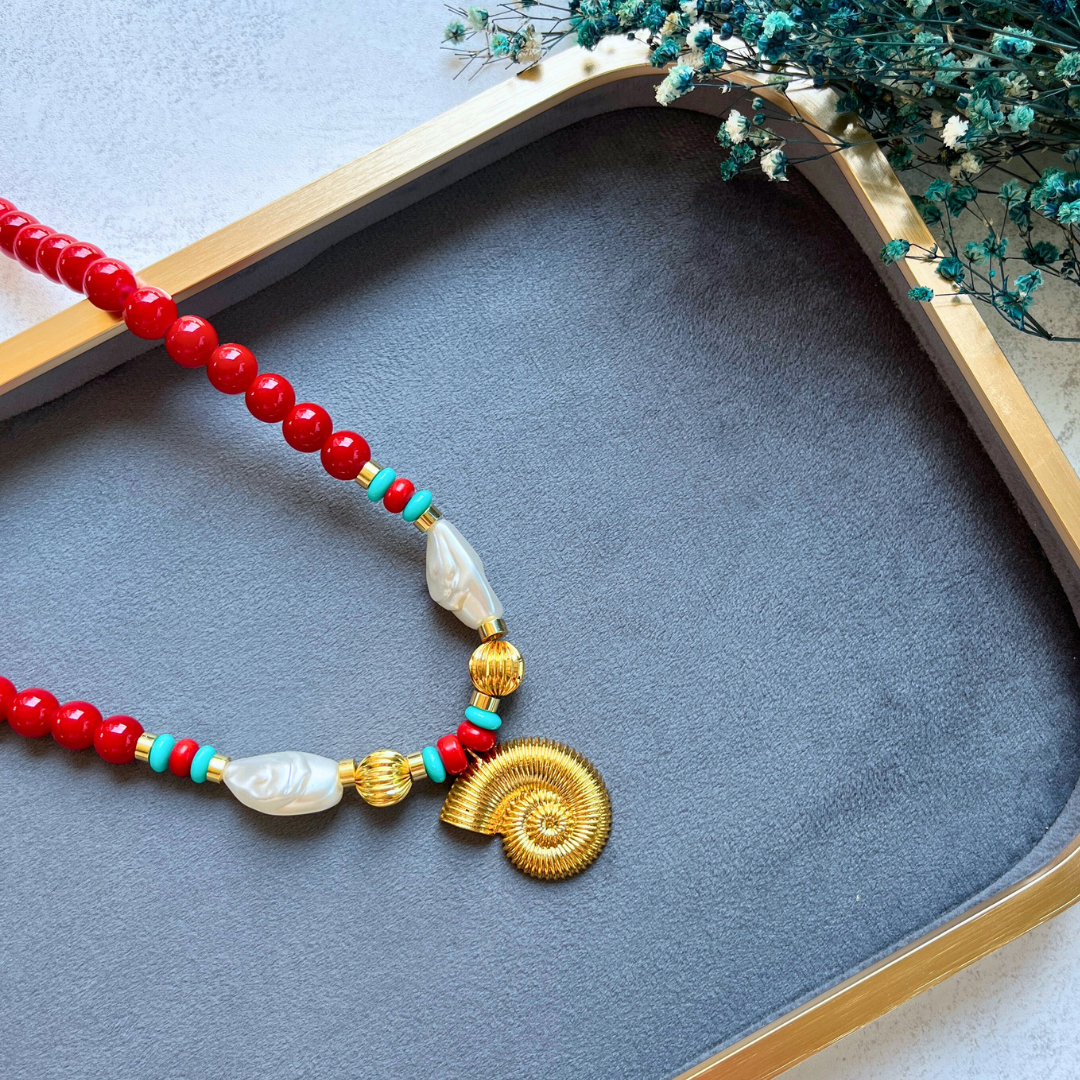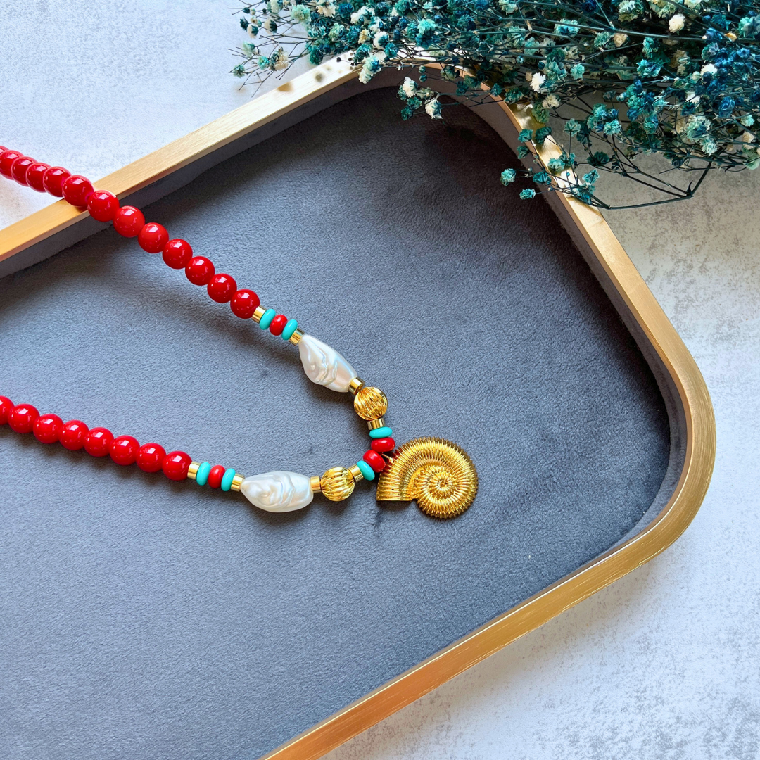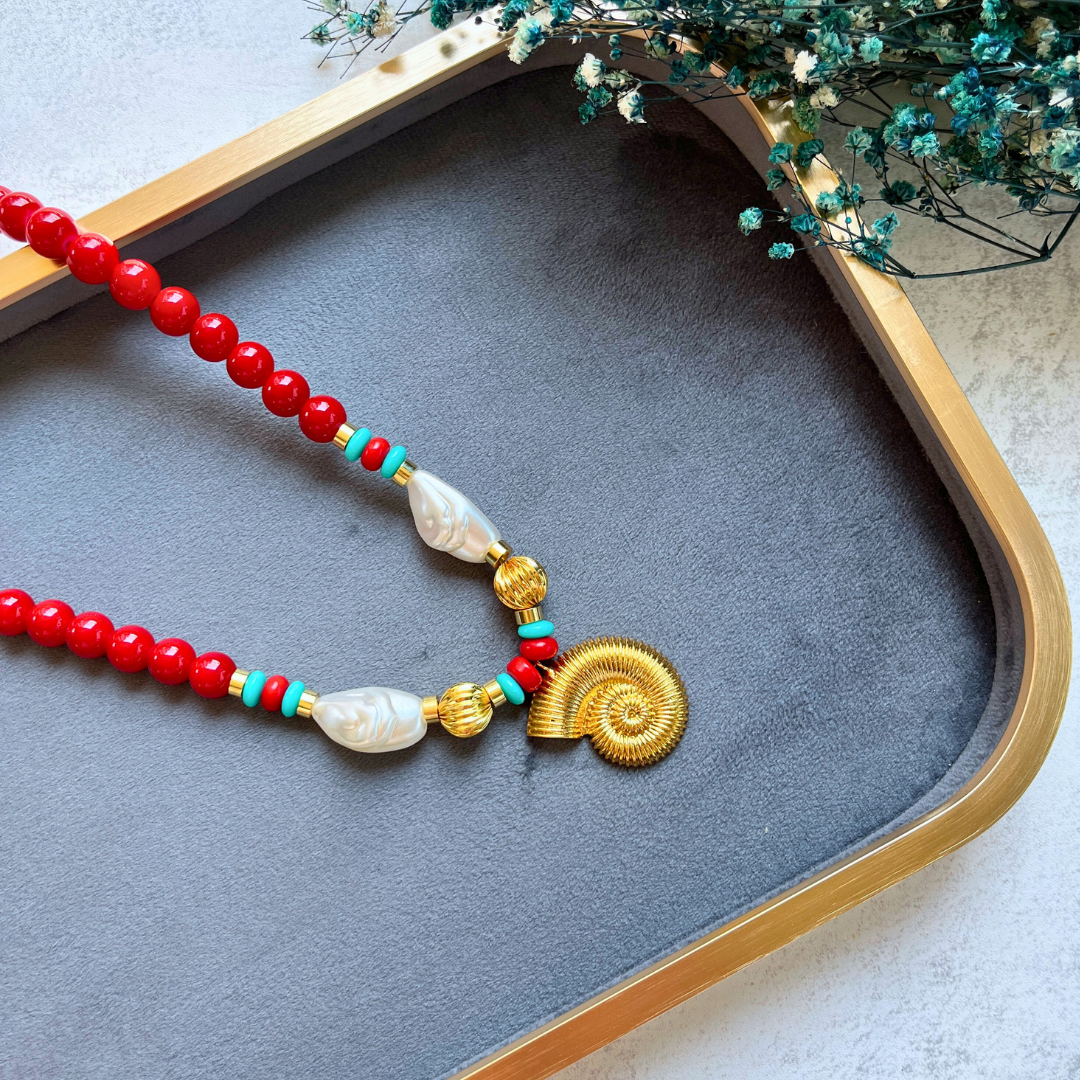 Kırmızı Mercan ve Sedef Detaylı Deniz Kabuğu Kolye I Mev'Armoni Collection