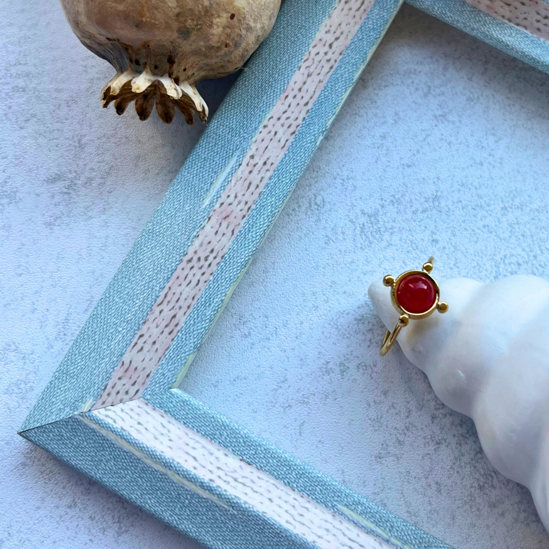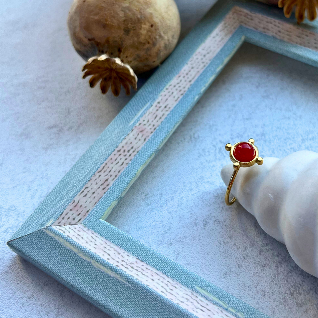 Canlı kırmızı doğal taş ile merkezde güçlü bir vurgu sunar.