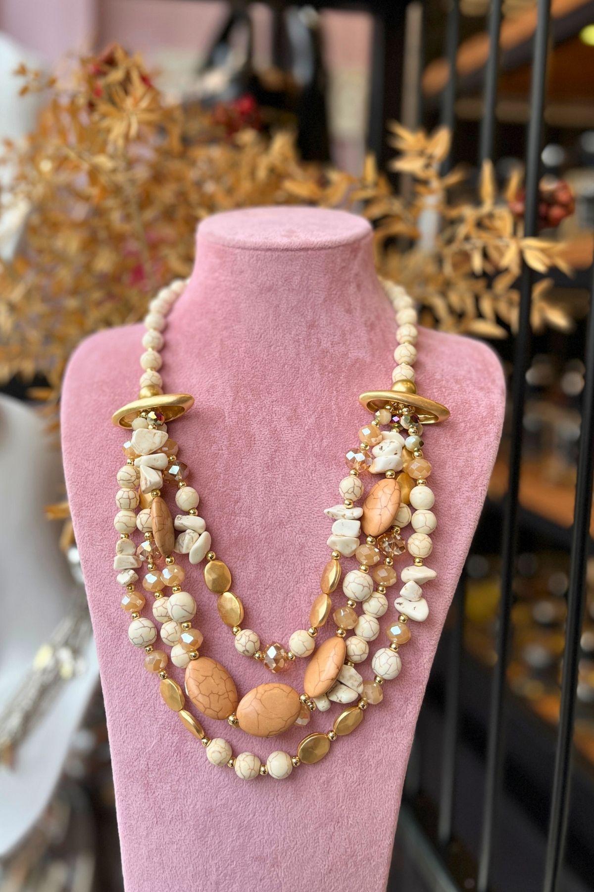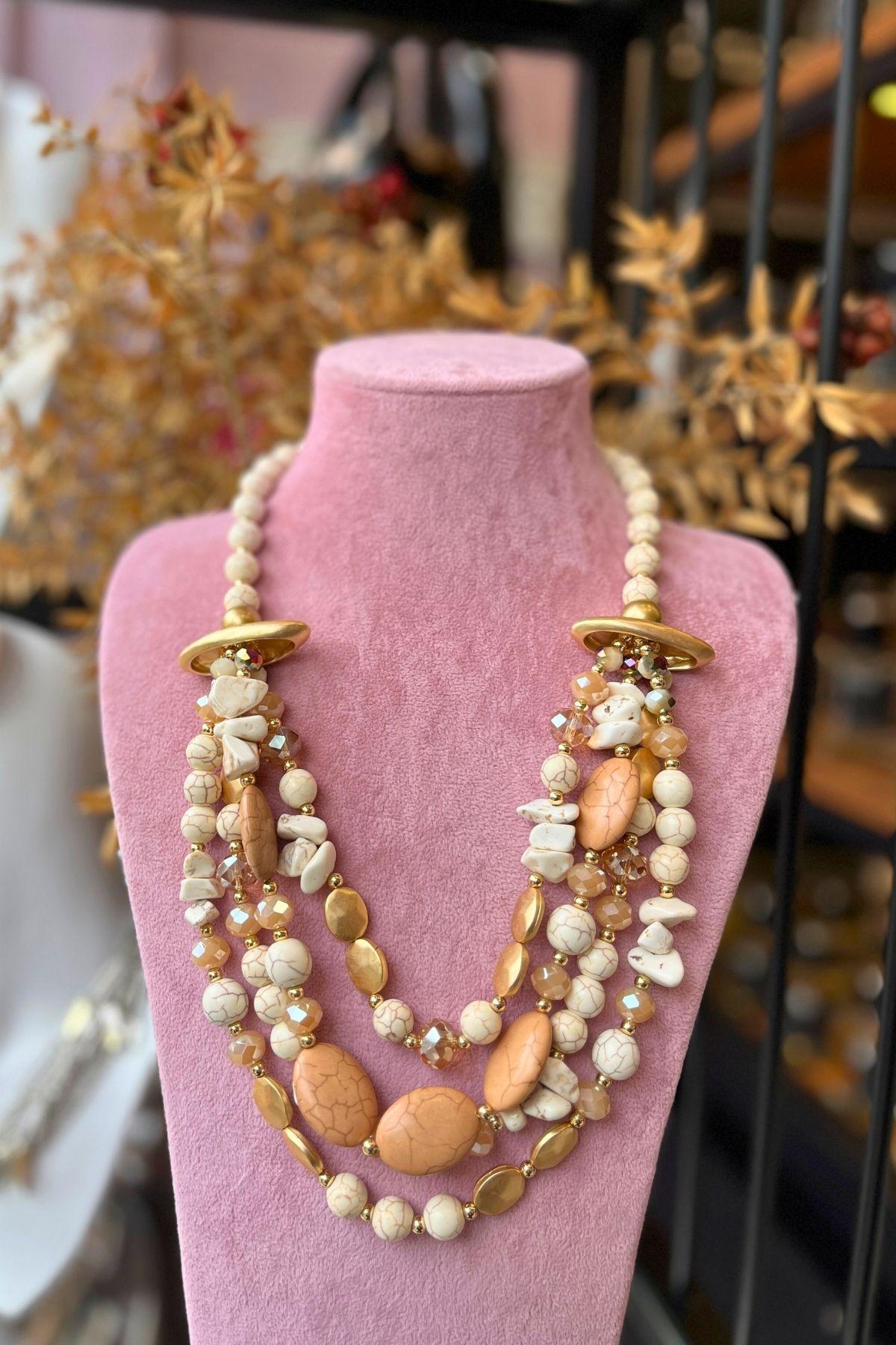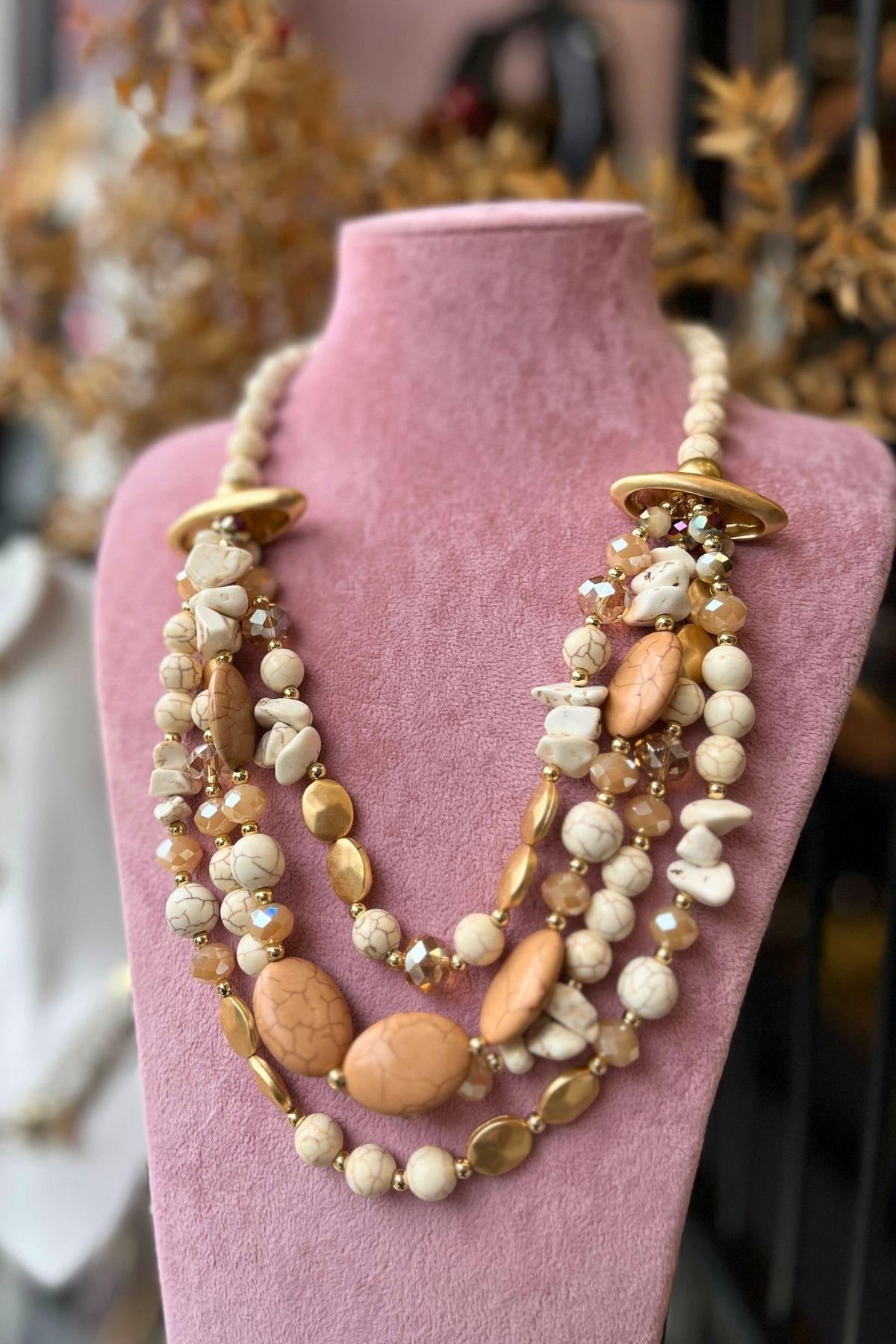 Zarif tonların doğal ışıltısıyla harmanlandığı bu özel tasarım kolye, Mev’Armoni’nin kusursuz uyum felsefesini yansıtıyor. Krem ve bej taşlar, altın detaylarla birleşerek sıcak ama sade bir şıklık sunar. Katmanlı formu, boyunda dolgun bir görünüm oluştururken taşların doğal dokusu tasarıma zarafet katar. Günlük kombinlerde natürel bir dokunuş, özel günlerde ise zarif bir odak noktası yaratır.