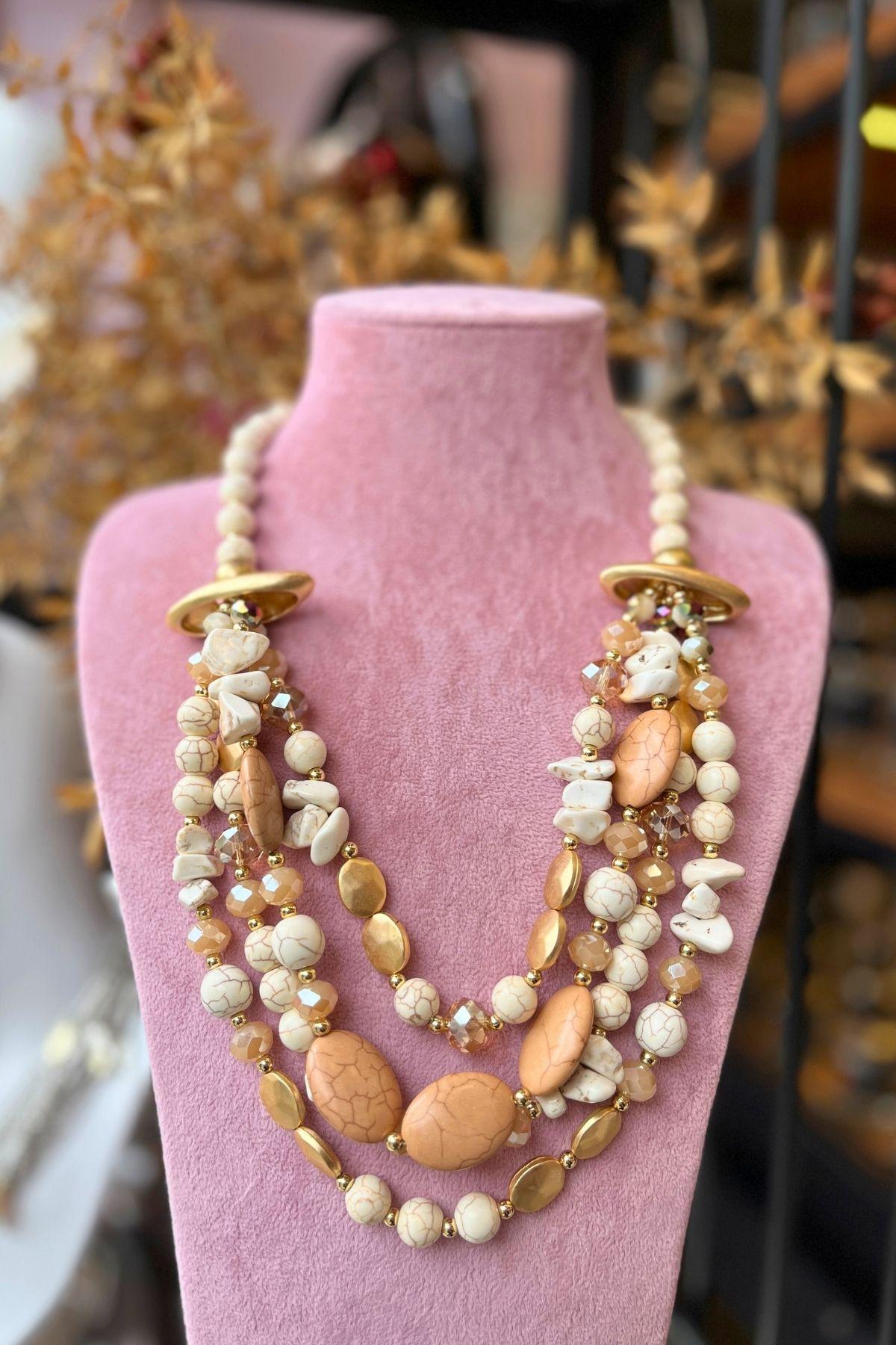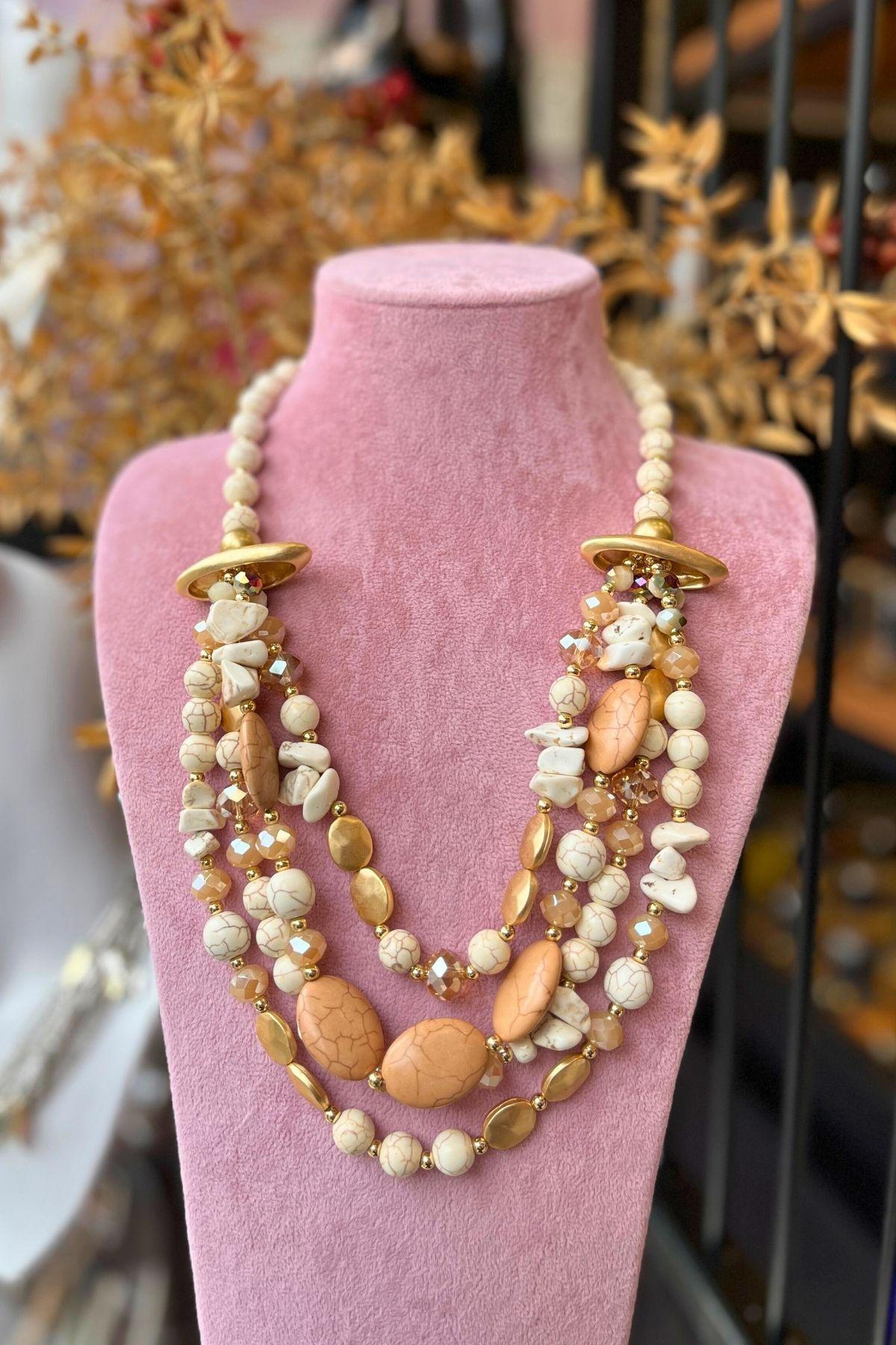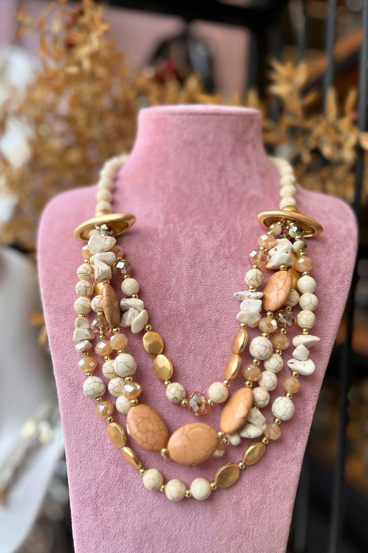 Zarif tonların doğal ışıltısıyla harmanlandığı bu özel tasarım kolye, Mev’Armoni’nin kusursuz uyum felsefesini yansıtıyor. Krem ve bej taşlar, altın detaylarla birleşerek sıcak ama sade bir şıklık sunar. Katmanlı formu, boyunda dolgun bir görünüm oluştururken taşların doğal dokusu tasarıma zarafet katar. Günlük kombinlerde natürel bir dokunuş, özel günlerde ise zarif bir odak noktası yaratır.