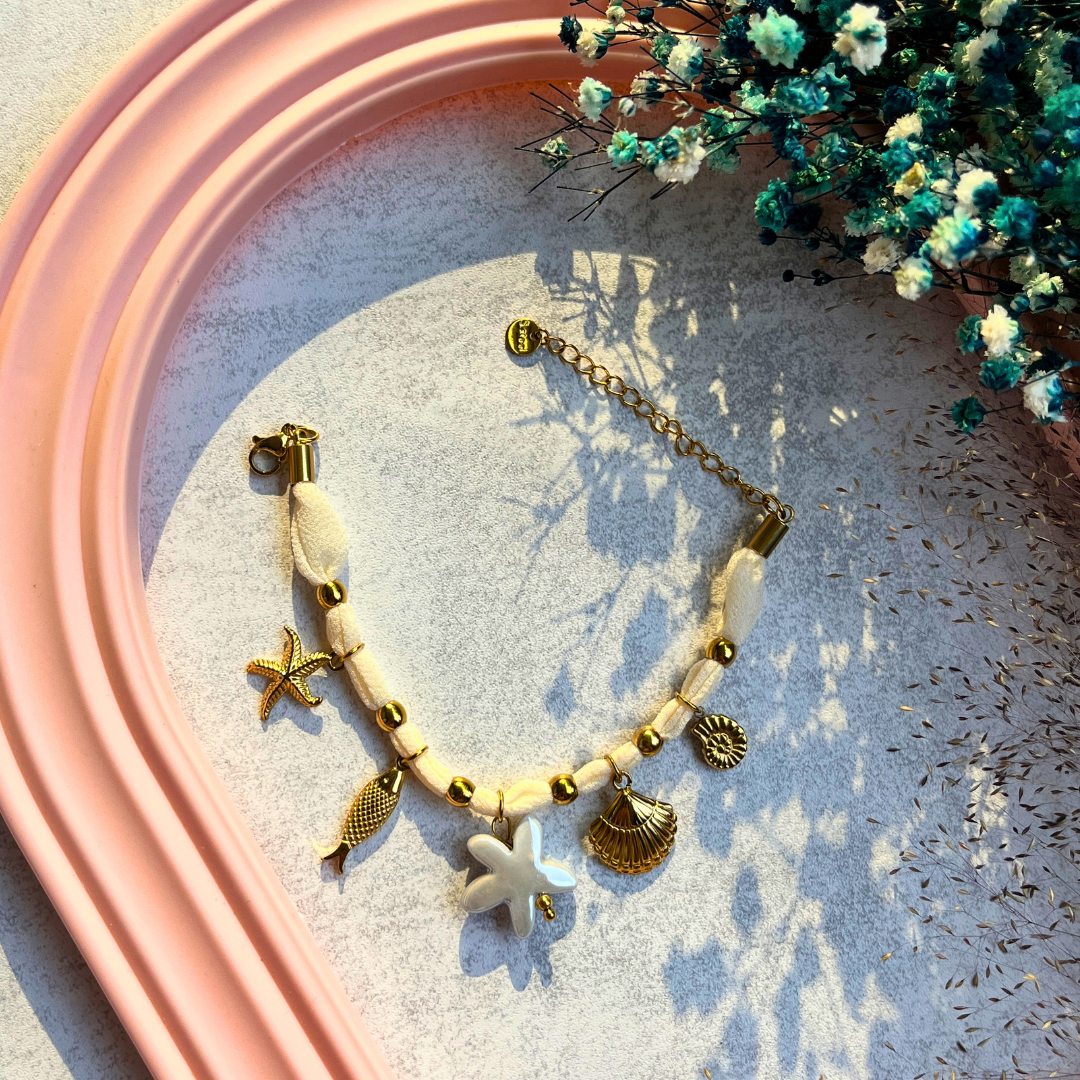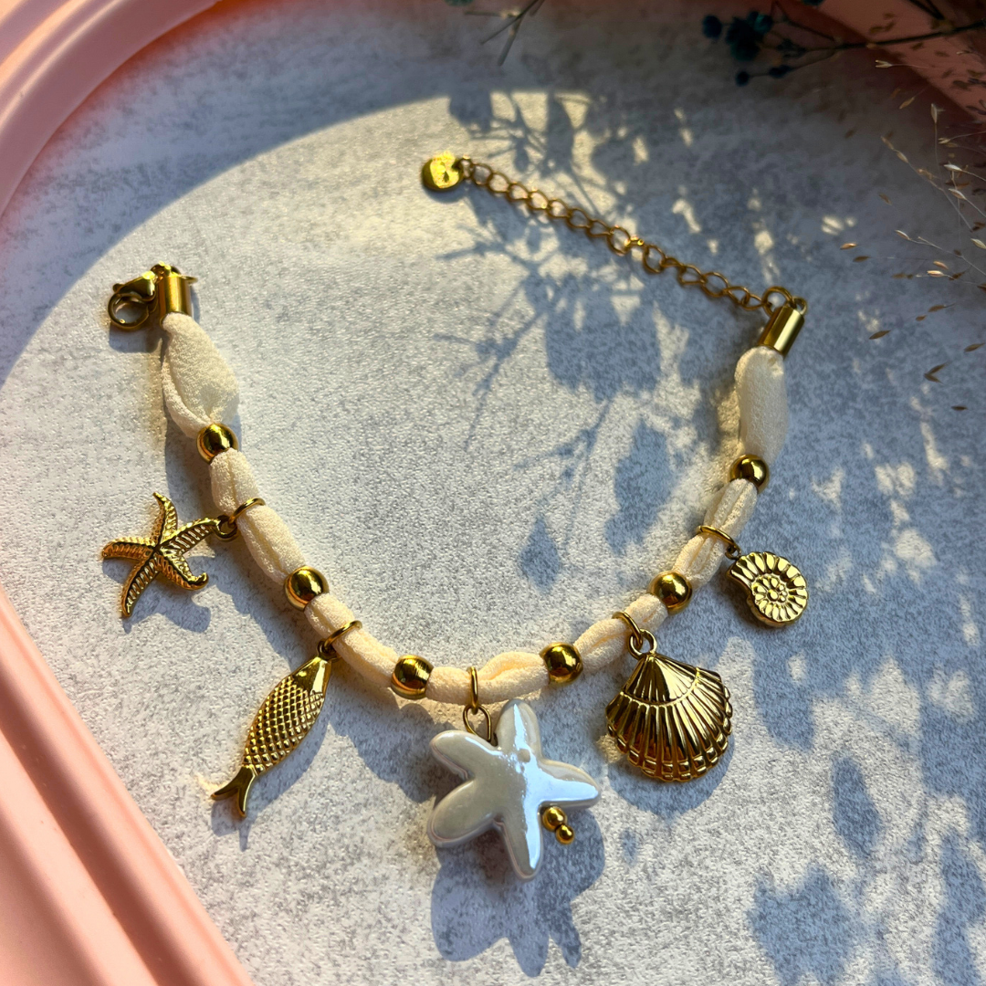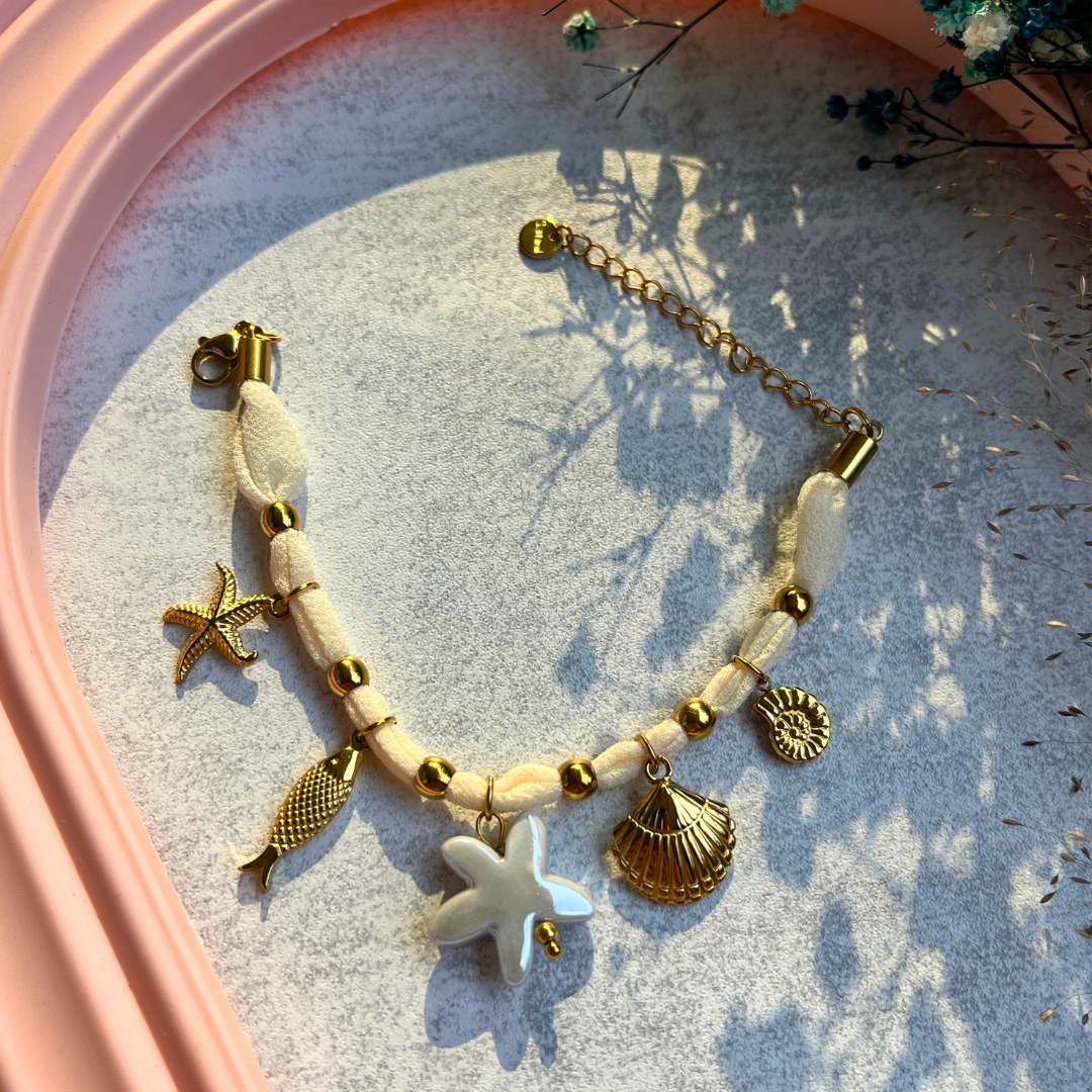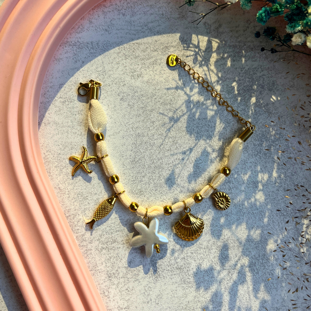 Yazın enerjisini bileğinizde taşıyın! Deniz yıldızı, balık ve midye figürlü bu özel tasarım, doğal dokulu kumaşla buluşuyor.
