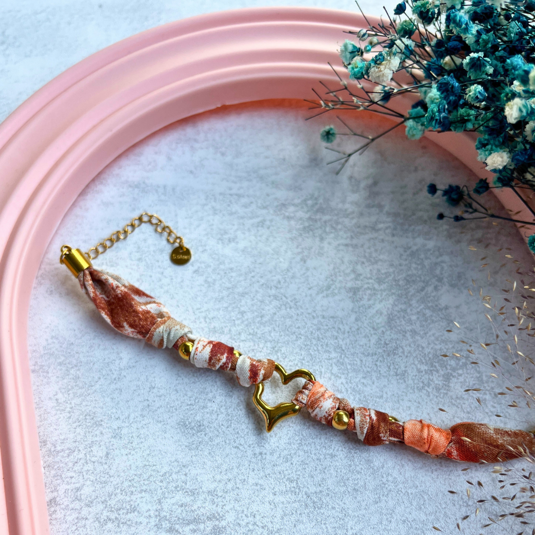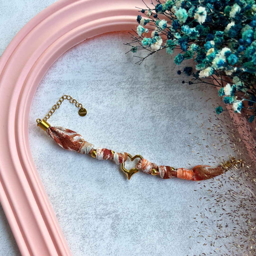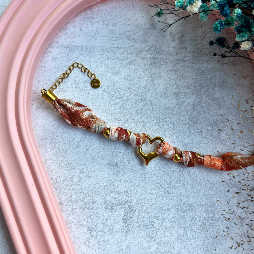 🤎 Kızıl ve bej tonlarda kumaş örgü tasarımıyla dikkat çeker. 💫 Altın renkli kalp figürüyle zarif bir romantizm sunar. 🧵 Yumuşak dokulu kumaş yapısıyla konforlu kullanım sağlar. 💎 Paslanmaz çelikten üretilmiştir, kararma yapmaz.