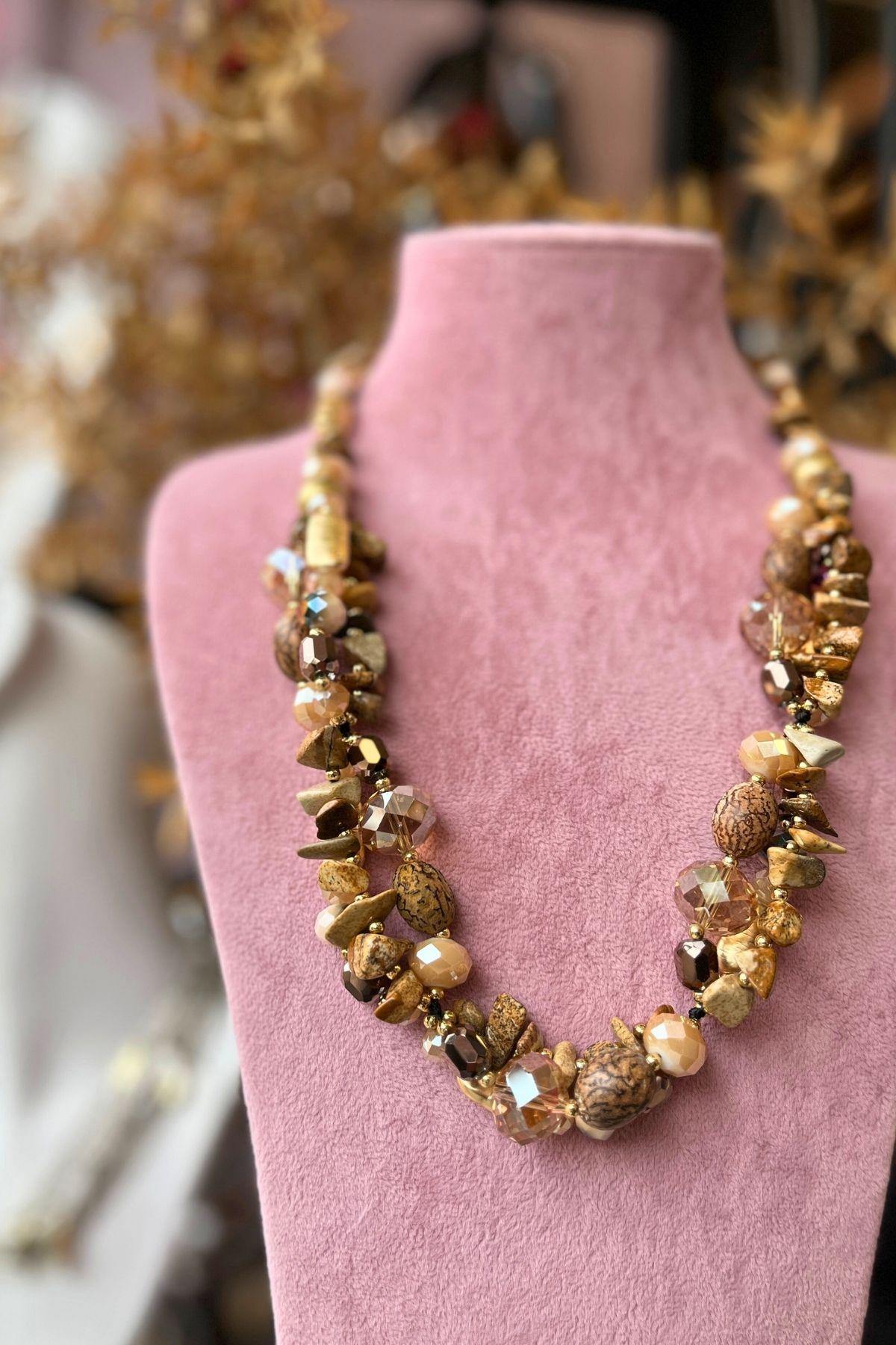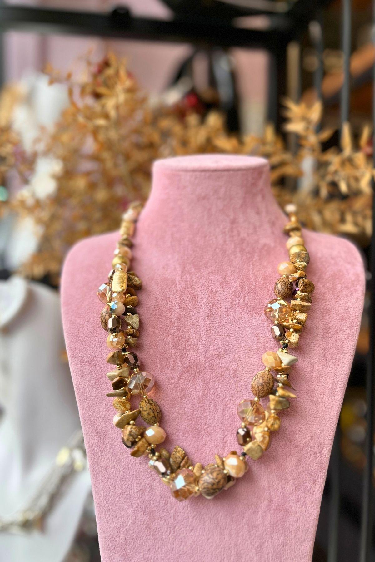 Doğanın özgün dokusunu zarif bir şekilde yansıtan bu tasarım, Mev’Armoni’nin uyum ve denge felsefesini bir kez daha öne çıkarıyor. Kumtaşı tonlarındaki doğal taşlar, altın ve şeffaf kristal detaylarla birleşerek sıcak bir ışıltı oluşturur. El işçiliği görünümüyle her biri kendine has dokulara sahip taşlar, sade kombinlerde bile dikkat çeken bir bütünlük yaratır. Her parçası özgün, her detayı doğal bir şıklık.