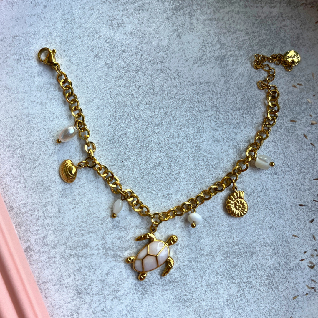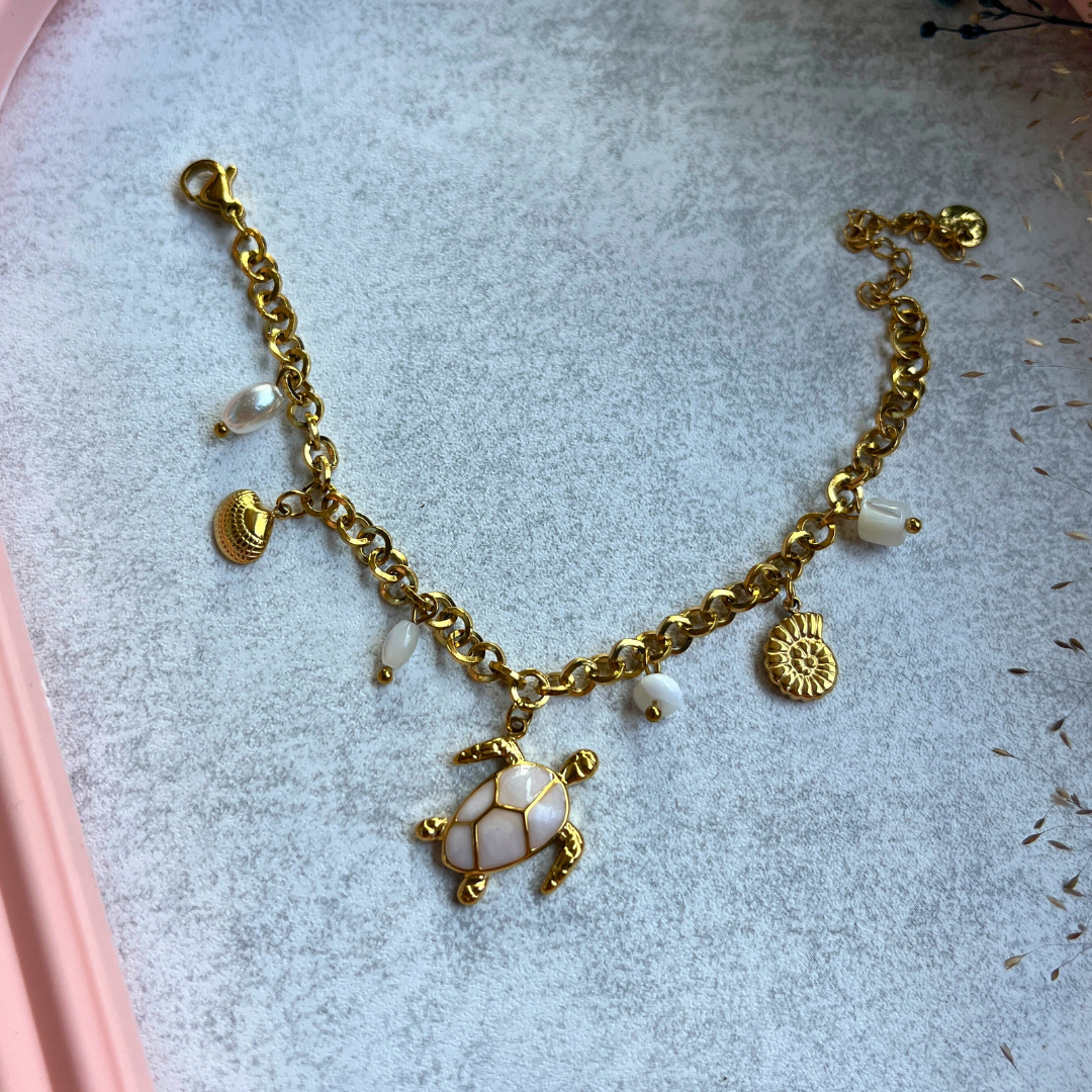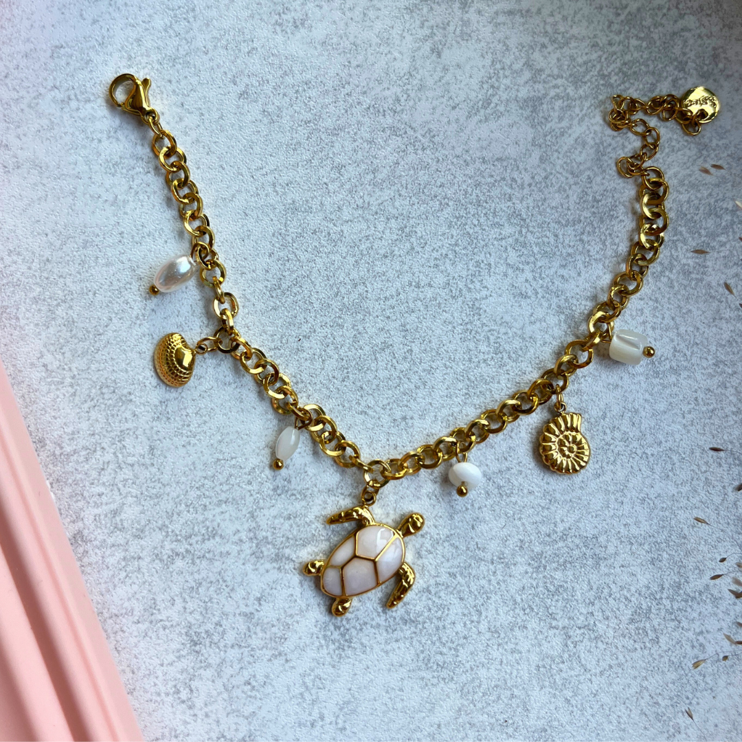🐢 İnci beyazı kaplumbağa figürüyle denizlerin zarafeti bileğinizde. 🌊 Deniz kabuğu ve spiral detaylarla süslenmiş zincir form. ✨ İnci formlu mini taşlarla yaz kombinlerine romantik dokunuş. 💎 Paslanmaz çelikten üretilmiştir, kararma yapmaz.