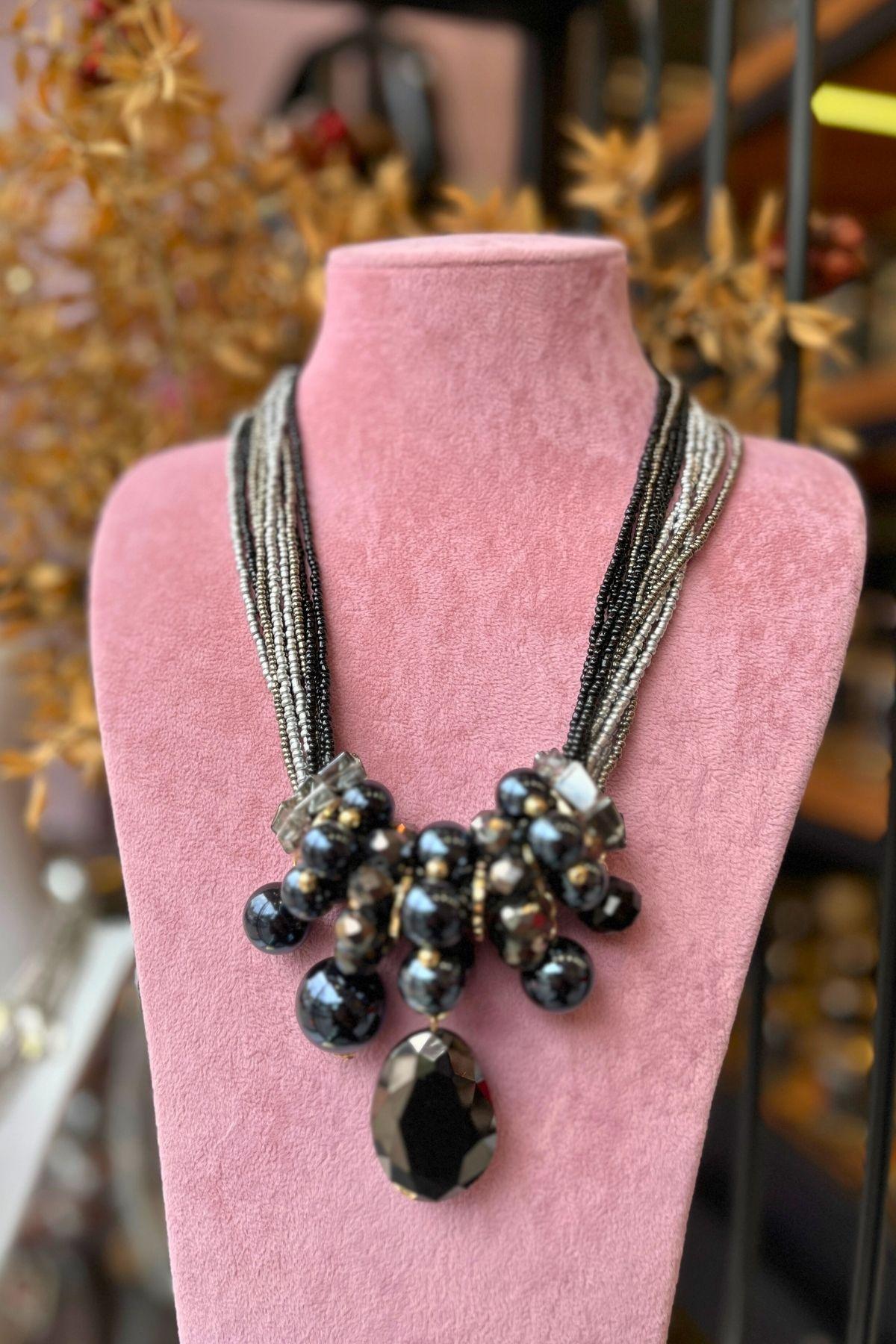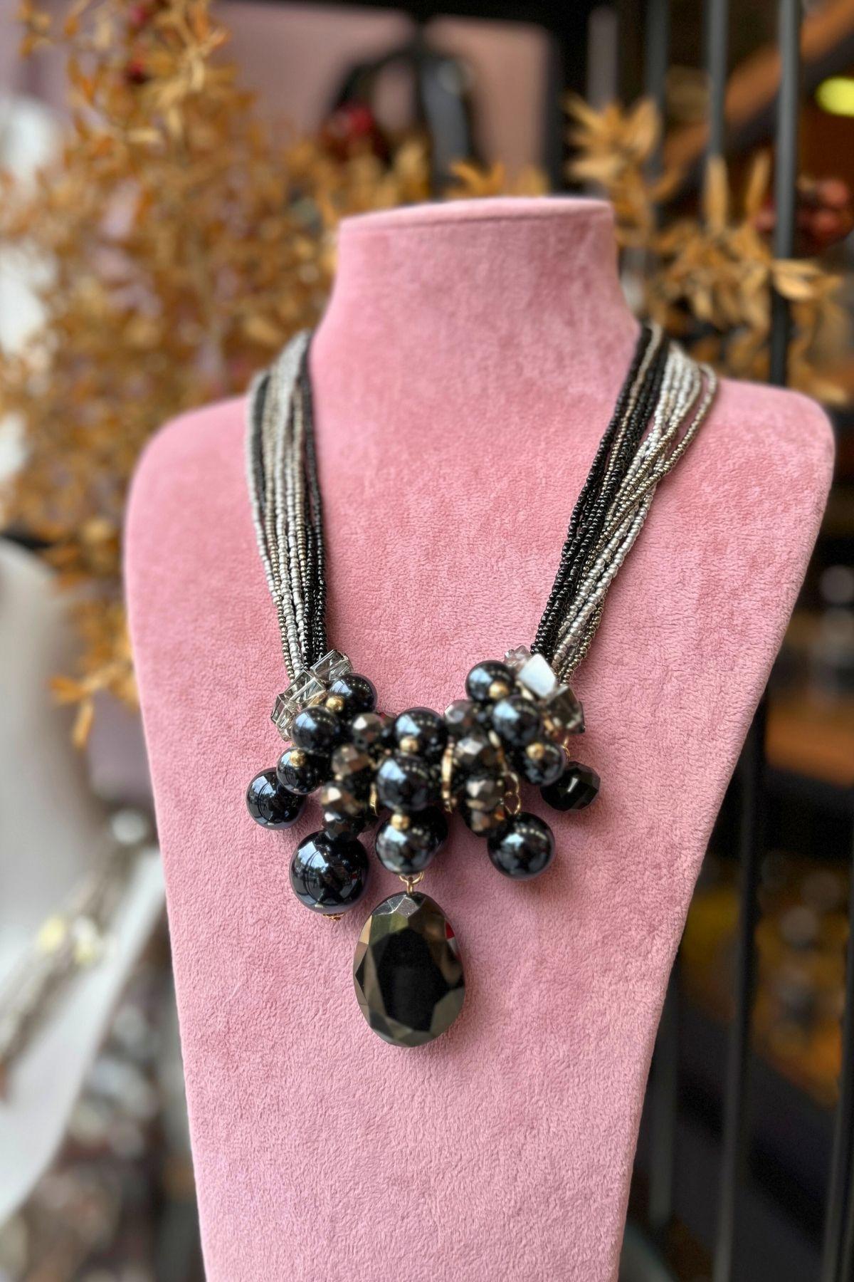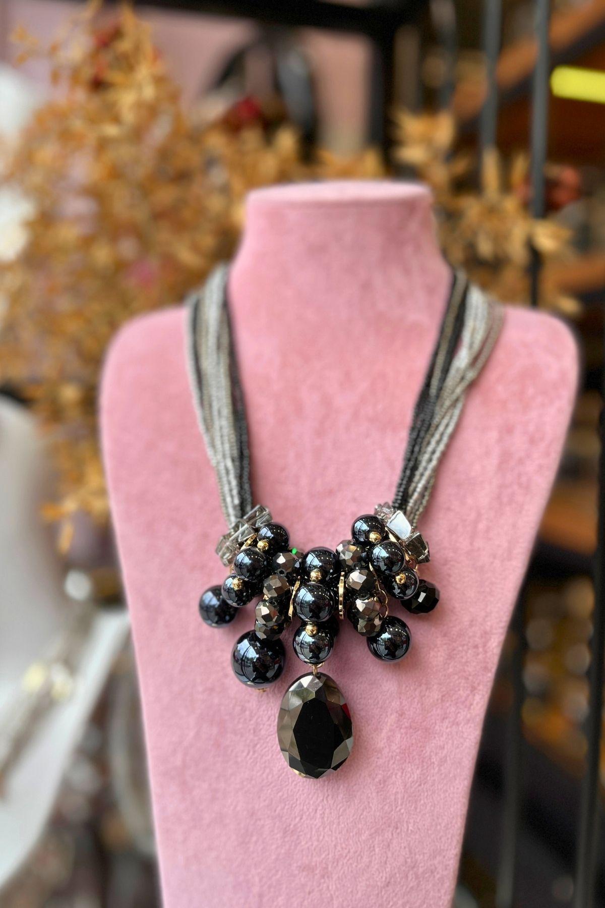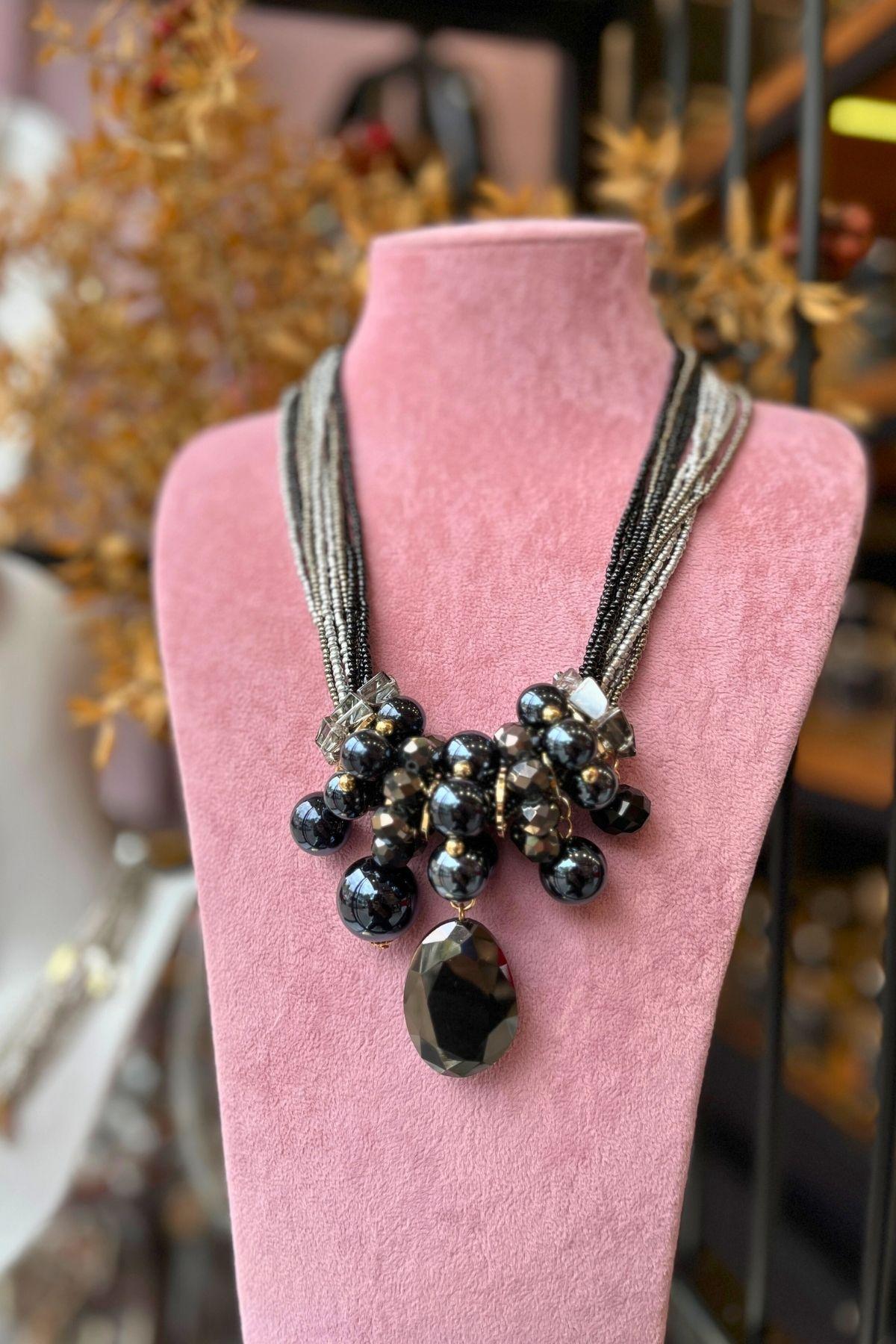 Koyu tonların zarafetini, form ve ışıltının uyumuyla buluşturan bu özel tasarım; Mev’Armoni’nin dengeli ve güçlü stil anlayışını yansıtıyor. Katmanlı siyah ve gri boncuk dizaynı, altın detaylarla birleşerek sofistike bir kontrast oluşturur. Geniş kesimli siyah taş merkezde odaklanarak sade ama iddialı bir duruş kazandırır. Günlük şehir şıklığında modern bir vurgu, özel davetlerde ise zamansız bir imza parça etkisi yaratır.